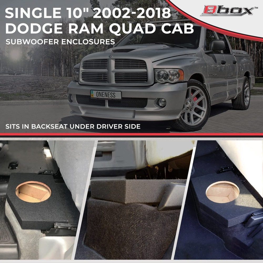 DUAL 10 INCH SUBWOOFER ENCLOSURE: Our Bbox 10 Inch Subwoofer Box is designed for optimum bass response and low frequency reproduction which is ideal for lower profile sound quality subwoofers. Feel, hear, and experience the difference today. Our subwoofer enclosures turn your vehical into a music machine! Dramatically improve the audio quality and bass response of your truck’s subwoofer system and listen to the music the way it was meant to be heard! OEM-FIT: OEM-Fit is designed and engineered specifically for the 2002-2017 Dodge Ram Quad Cab trucks to ensure an OEM fit with out impeding the operation of the back seat. The subwoofer mounting depth is ideal for low profile subwoofers. All our vehicle-specific enclosures are built with a near perfect factory fit in mind. HIGH GRADE MDF: Our subwoofer box enclosure is built with a durable high-grade MDF that is 3/4 inches thick for solid frequency response and accurate music reproduction. The thick MDF panels and no flex construction on our 10 inch subwoofer box allows for tight and accurate bass reproduction. AIRTIGHT RECESSED SIDE PANELS: By using premium materials and aliphatic resin wood glue, the solid construction of our subwoofer boxes are airtight and resonant free. This greatly reduces rattles and improves the overall sound quality of your sound system. ENCLOSURE DIMENSIONS: Since your subwoofer box or enclosure most likely goes into the boot of your car, checking their dimensions is highly important. OEM Grade Rugged Liner is a spray liner finish designed to take a beating and helps seal seamsand prevent air leaks. Product Dimensions Sub cut out: 9.125”, mounting depth: 6”, height: 7.25”, width: 20.25”, depth: 13.25”