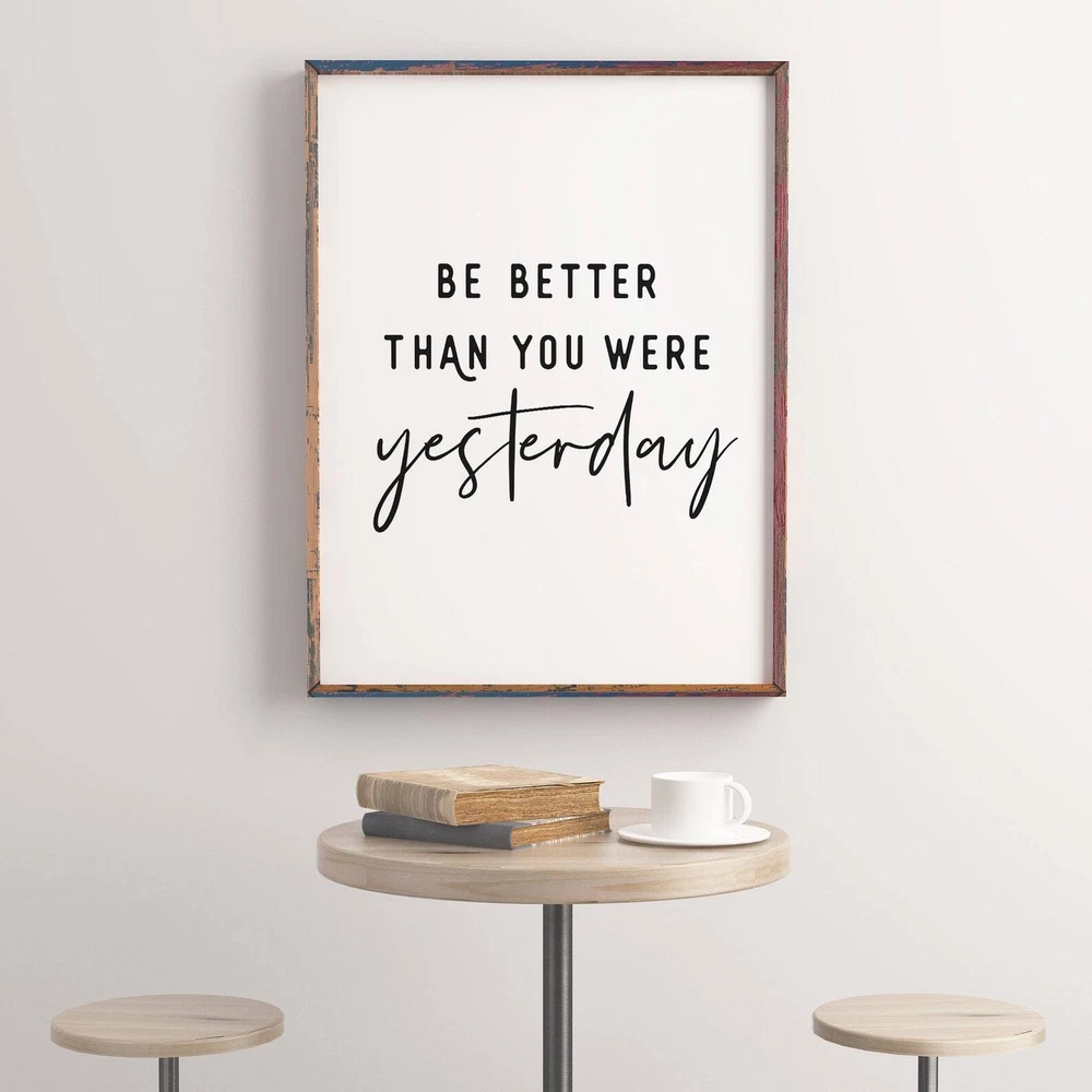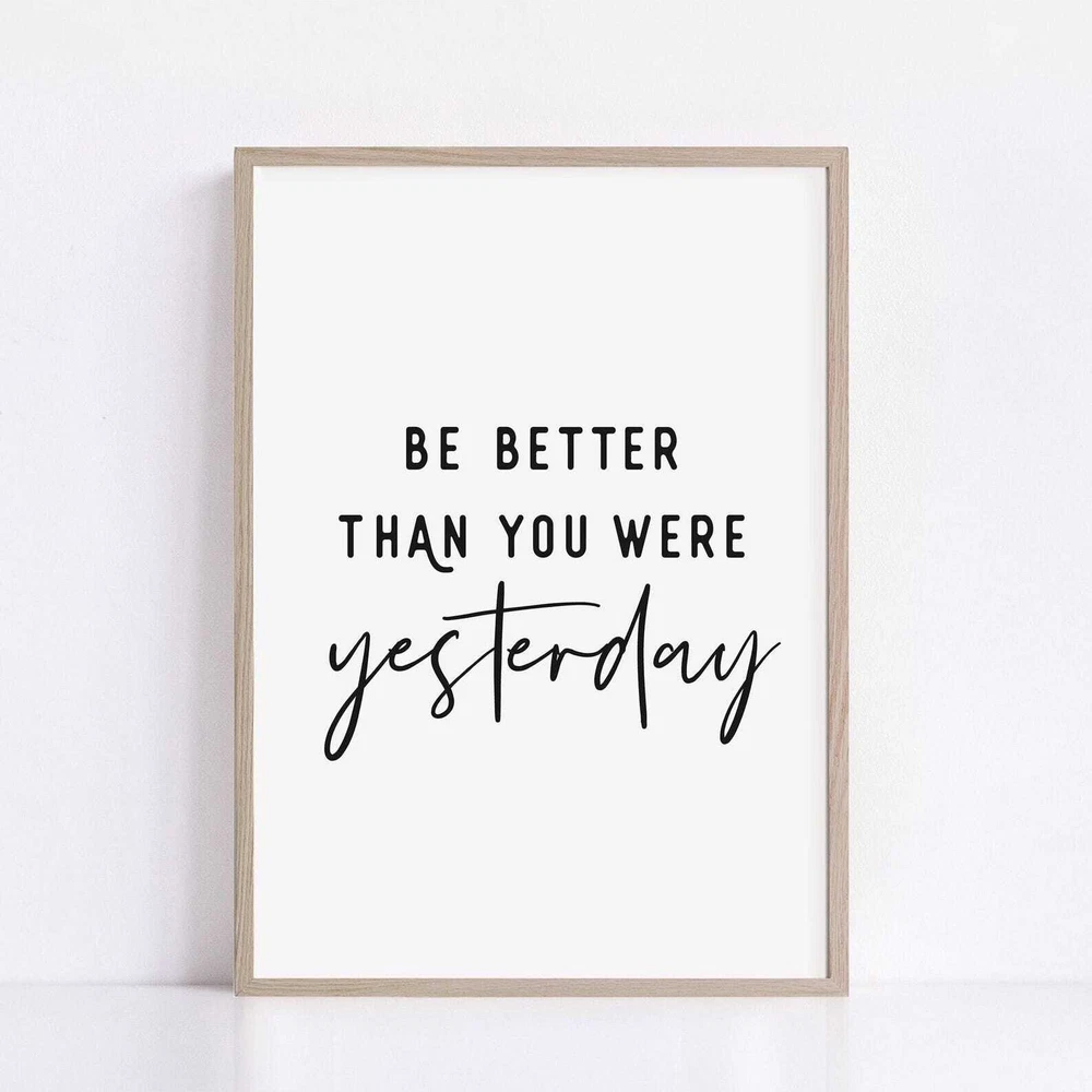 Be Better Than You Were Yesterday Poster Inspirational Quote Office Decor Printable Office Wall Art Wall Signs Material: Premium luster photo paper Print type: Inkjet printing One side printed + The finish provides the highest possible resolution and color saturation + Lasts up to 200 years in color and 400 years in black-and-white + Printed on high-quality resin-coated photo base paper medium + Posters can be hung with double-sided tape, tacks, or framed + Hand washing with a gentle cry cloth is recommended for extended durability I will hand select the best choice of paper for your chosen design to ensure top quality results for a beautiful, bright and luxurious print. All prints are sealed in cellophane slips for protection during transportation, and are shipped in a protective cardboard envelope.