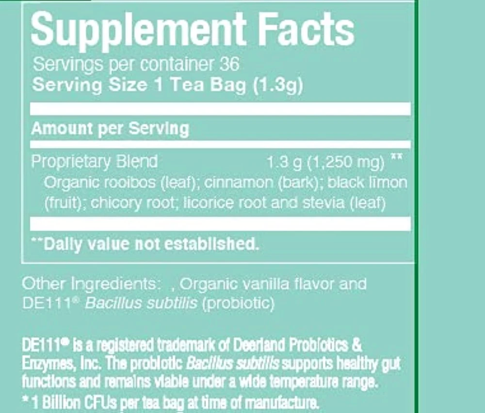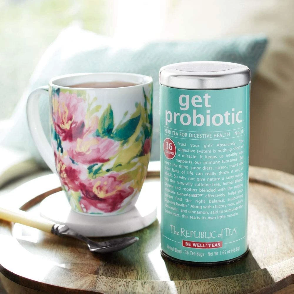 Support your digestive * with Get Probiotic Tea For Digestive . This caffeine-free tea features organic rooibos and the probiotic GanedenBC30 to help your system find the right balance, along with chicory root and cinnamon to help stimulate the gastrointestinal tract.* The probiotic tea offers a light, refreshing flavor with a zing of citrus and a touch of natural vanilla flavor. To enjoy this digestive tea, simply heat fresh, filtered water to a rolling boil. Then, pour 6 ounces of water over the tea bag and steep for 5–7 minutes. A leading purveyor of premium teas since 1992, is dedicated to enriching people’s lives through the experience of great-tasting tea, emphasizing a Sip by Sip Rather Than Gulp by Gulp lifestyle. *These statements have not been evaluated by the Food and Drug Administration. This product is not intended to diagnose, treat, or prevent disease. Pregnancy and Lactation: Do not use during pregnancy or lactation without the advice of a healthcare practitioner.
