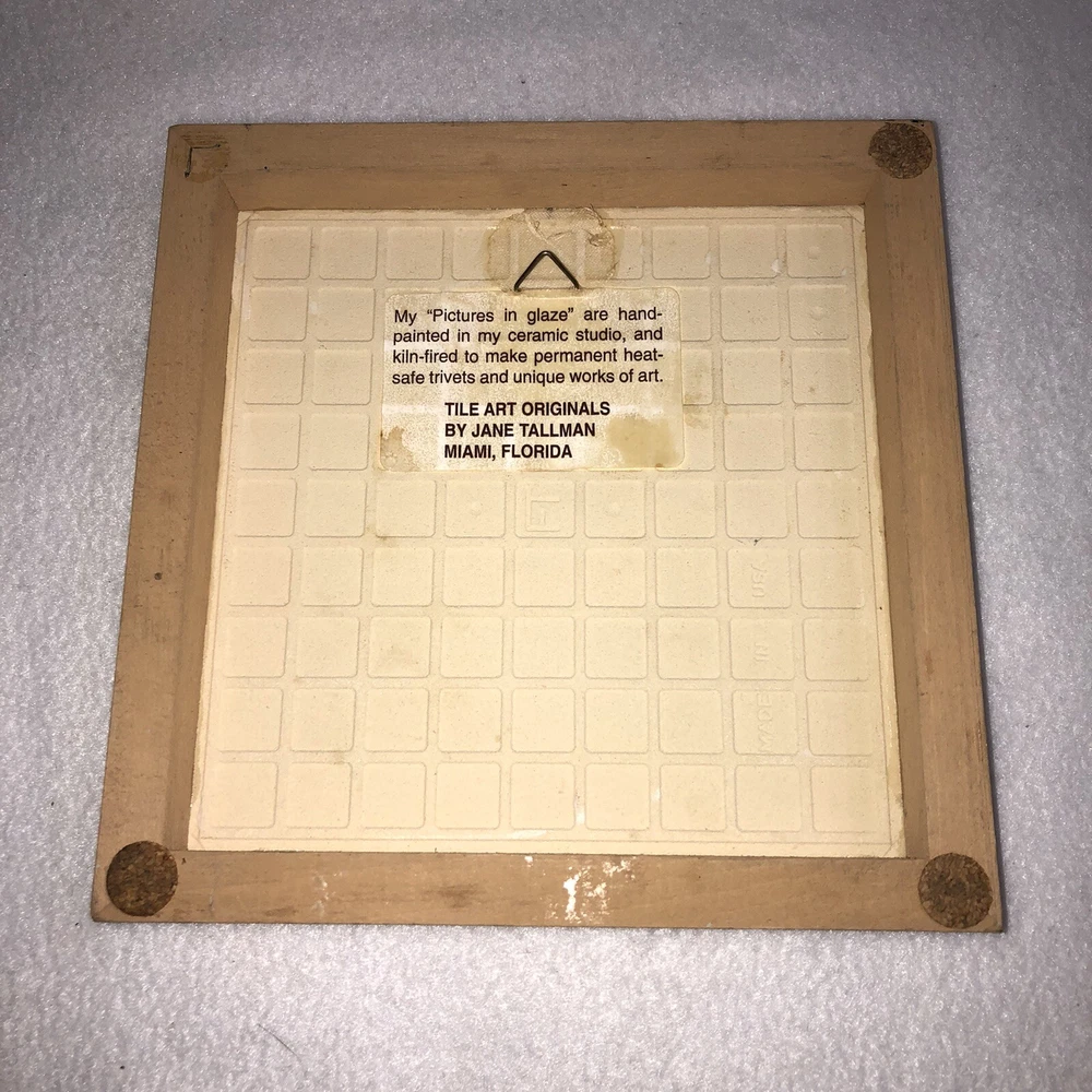 This is a beautiful Tile Art Originals by Jane Tallman of Miami Florida tile trivet. It has a Beach theme and features a Conch Shell. It is done in soft earth tone colors of beige, tan, white and pink. The trivet is encased in a wood frame. Could be used either as a wall hanging or as a hot plate/trivet. There is a hook on the back for hanging. It measures approximately 7 inches by 7 inches. Trivet is in good pre-owned condition. There are no nicks, chips or cracks. One of the small round cork feet is missing. Tile Art Originals sticker is still in place on the back side of the trivet. Please review all photos for additional details, views and measurements. Shipped via USPS Ground Advantage.