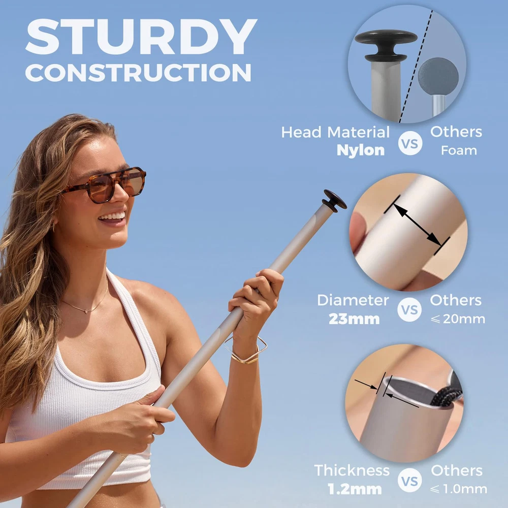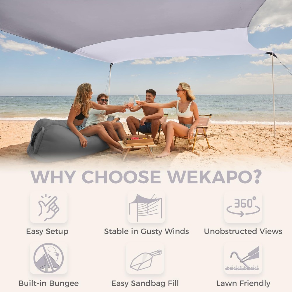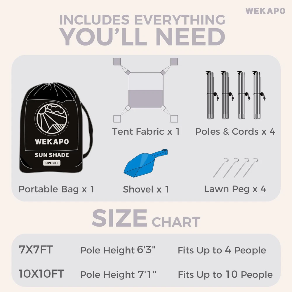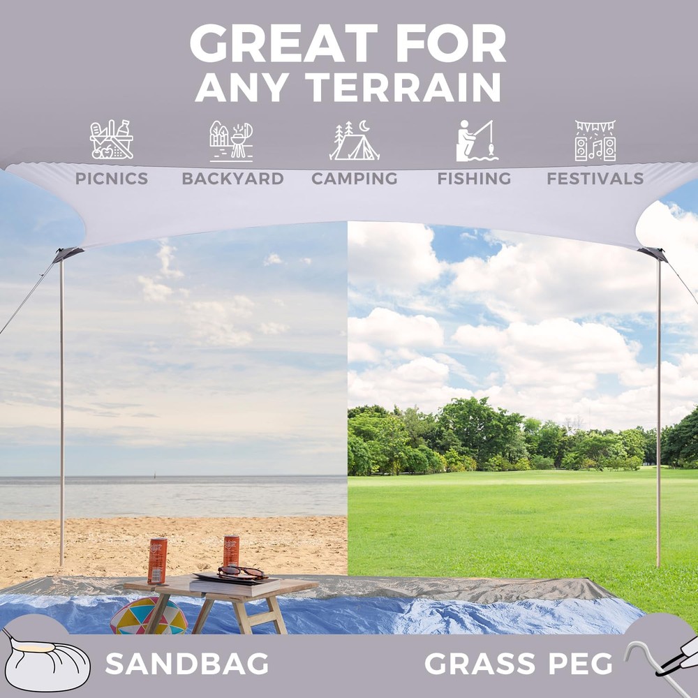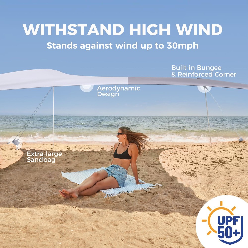 SIMPLE & STRESS-FREE BEACH SHADE SETUP: Forget complicated instructions! Our unique beach canopy design makes assembly a breeze. Simply connect poles to corners with built-in bungee cord, fill sand bags, stretch canopy fabric and stand poles upright - no more guesswork or frustration! BUILT TO WITHSTAND THE WIND: Say goodbye to flimsy beach canopies! Reinforced square corners and sturdy poles ensure your beach shade stands strong, even in windy conditions. Enjoy lasting fun under the sun for years to come. STABLE & WINDPROOF DESIGN: Flapping is a thing of the past! Our aerodynamic canopy top eliminates wind catches, while extra-large sandbags provide unbeatable stability. Relax and enjoy your beach or park time with confidence. SPACIOUS & EXTRA-STABLE: beach tent stands out from the crowd with its sturdy design and breezy interior! Thicker, stronger and higher aluminum poles offer superior stability and create a generous interior for you and your loved ones. PREMIUM SUN PROTECTION: Stay cool and safe under the beach shade canopy! Our UPF 50+ water-resistant fabric shields you from harmful UV rays, perfect for worry-free beach days with family and friends. UNPARALLELED CUSTOMER CARE: We go beyond the sale! Our dedicated team is always here to answer questions, assist with purchase decisions, and offer post-purchase support. Enjoy peace of mind and outdoor adventures with .