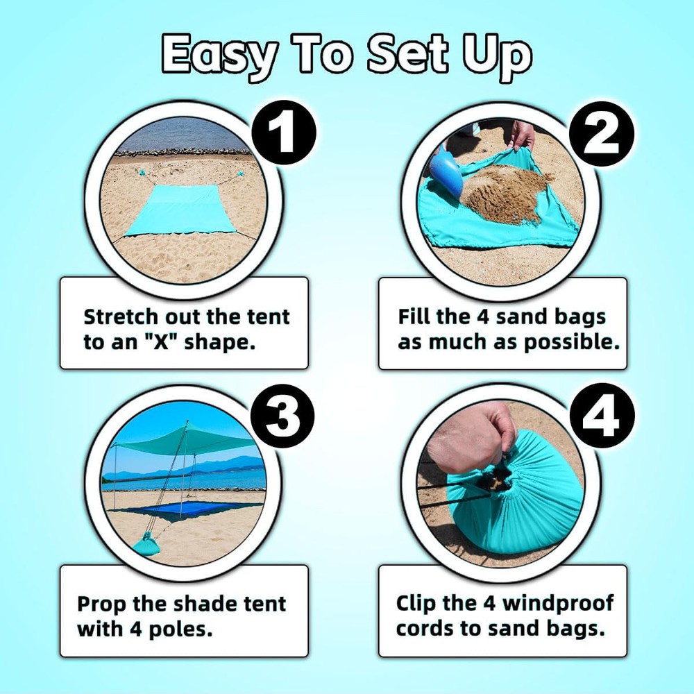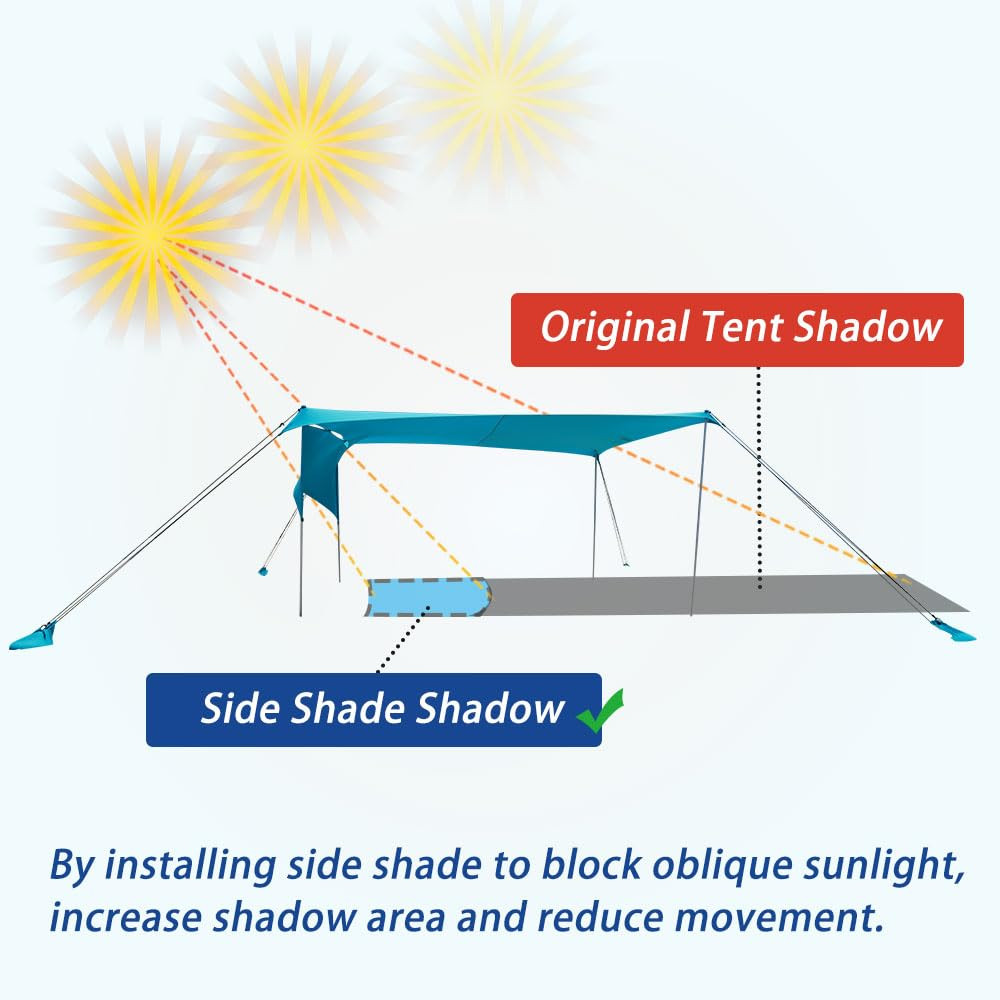 [ Patented Movable Side Shade Design ] - Superior to all beach shade tents of the same type, it provides additional side shade, and can be moved to provide the best shading experience as the angle of sunlight exposure changes throughout the day. [ Portable and Quick Assemble ] - We know it’s a pain to spend a lot of time on assembling and repackaging. So we pre assembled some accessories before shipment to allow you to quickly set up this beach shade tent or pack it up to the small storage bag for carrying. And the total weight only 10.95 lbs! [ Upgraded Sun Protection Fabric ] - True UPF50+ filters out up to 98% of UV rays. Compared to other so called UPF50+ sun shade tents, you can clearly feel a cooler shade by beach shade tent. [ Maintain Stability In Strong Breeze ] - Paired with 4 sandbags and 4 extra windproof cords, It can maintain stability under the wind speed of up to 26 mph (Beaufort: Strong Breeze). You won't have to worry about any unexpected gusts of wind spoiling your day. [ Not Just Beach Sun Shelter ] - Water resistant sun protection fabric, let you enjoy a leisure time whether it's sunny or rainy. Come with 4 ground stakes to replace 4 sand bags for installation the sun shade tent on grass.
