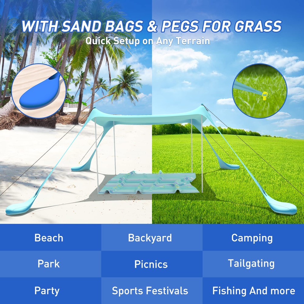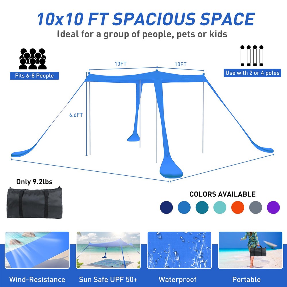 Large Family Sun Shelter - beach tent sun shade canopy's four 6.6FT tall aluminum poles keep entire canopy area stays at full height that increasing the shaded area by 50%.10x10FT is enough for 6-8 people. 7x7FT is enough for 3-6 people. It holds up well in the wind because of the extra big sand anchors and high quality rust-proof aluminum poles.Providing enough space for couples, families and friends' party. FOUR CONVENIENT FAMILY SIZES. Choose the ideal that works for your family needs Advanced Sun Protection - Our sun tents for beach and outdoor crafted with high quality elastic Lycra fabric, offering UPF 50+ sun coverage protection. Can block up to 98% of harmful UV rays, reduce sunburn or glare with protection coating making it ideal for kids or adults laying out. Superb shade windproof, water resistance beach sun cover keep you protected on both sunny and rainy days. Combined with excellent 4-sided ventilation performance enjoy the sea breeze in the shade of the beach Quick and Easy Outdoor Setup - Each beach tent comes with stability poles, anchors and windproof ropes that let you use it over sandy beaches,thick grassy areas, or even in rocky camping spots. Equipped with sand shovel to quickly hold large amount of sand to anchor and overfill all 4 sandbags.Foldable thickened rust-resistant aluminum poles has a pointed stake at the bottom can stick them straight into the sand or ground.The sturdy EVA foam ball on top of the poles won't tear the fabric Easy Assemble and Portable - Prepare the beach tents sun shelter pop up in a matter of minutes. Just stretch out canopy and fill flarge sand anchor fully, use the foldable pole to support the tent. Secure the fabric on the EVA ball with bungee cords and pull tight. Pull sandbags away to tighten structure. If needed, bury sandbags and use the ground pegs to add windproof ropes. And when the trip is over, you can easily take it off. The easy-to-carry waterproof travel bag weighs only 6.5 pounds! All-Purpose Pop Up Beach Tent - For family trips to the beach,weekend tailgating party or summer camping picnics,cool beach umbrellas for extra enjoyment on hot days. Comes with a portable storage bag easily accommodates Lycra canopy,folding aluminum poles,tent pegs,elastic cords,sand shovel etc. you can popup almost anywhere. This portable pop up beach tent sun shelter can become your go-to companion when going to the beach, camping,park,picnic party,fishing backyard barbecue or music festival!