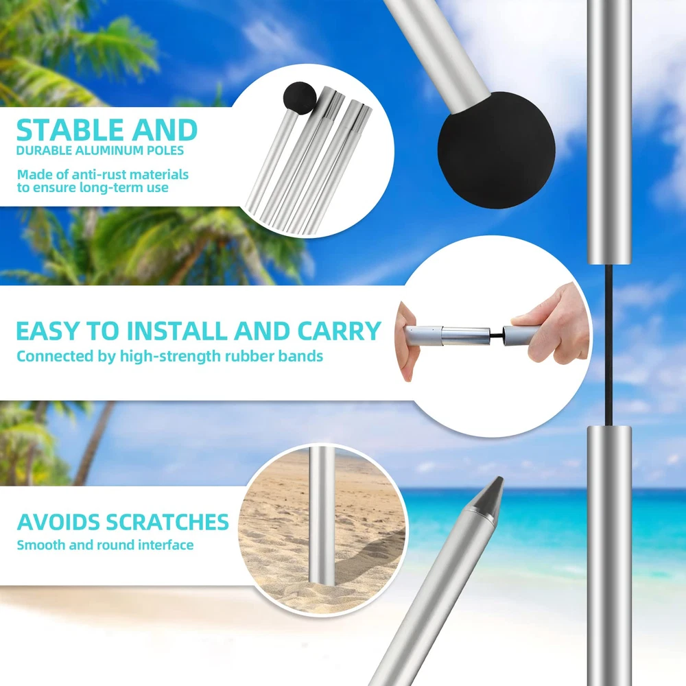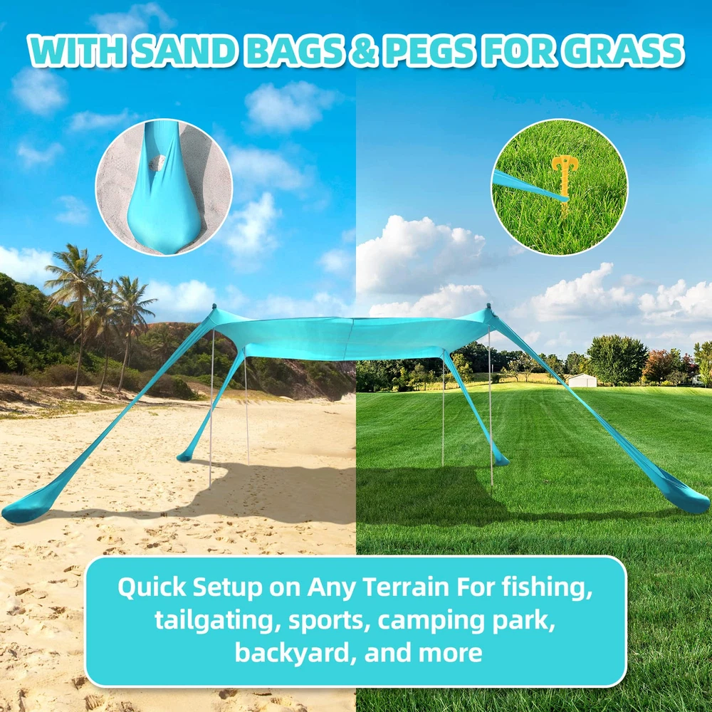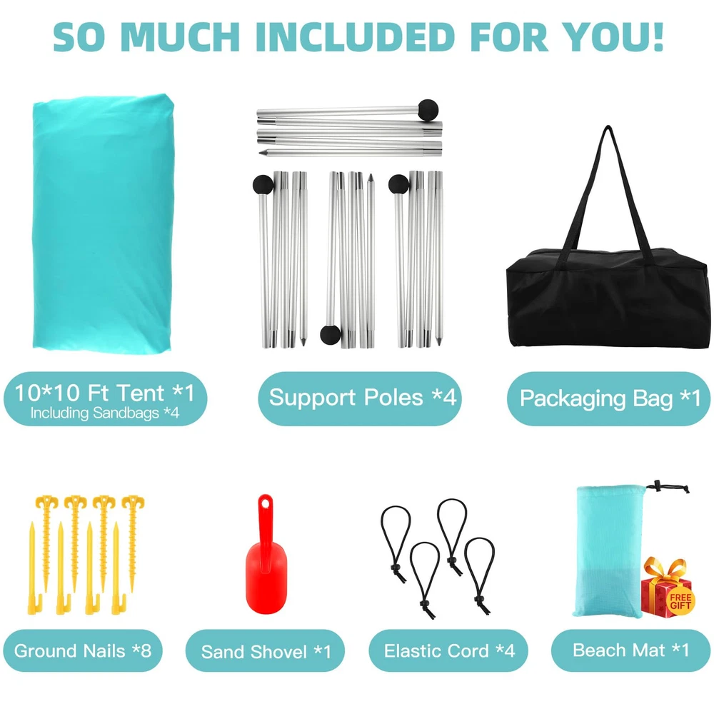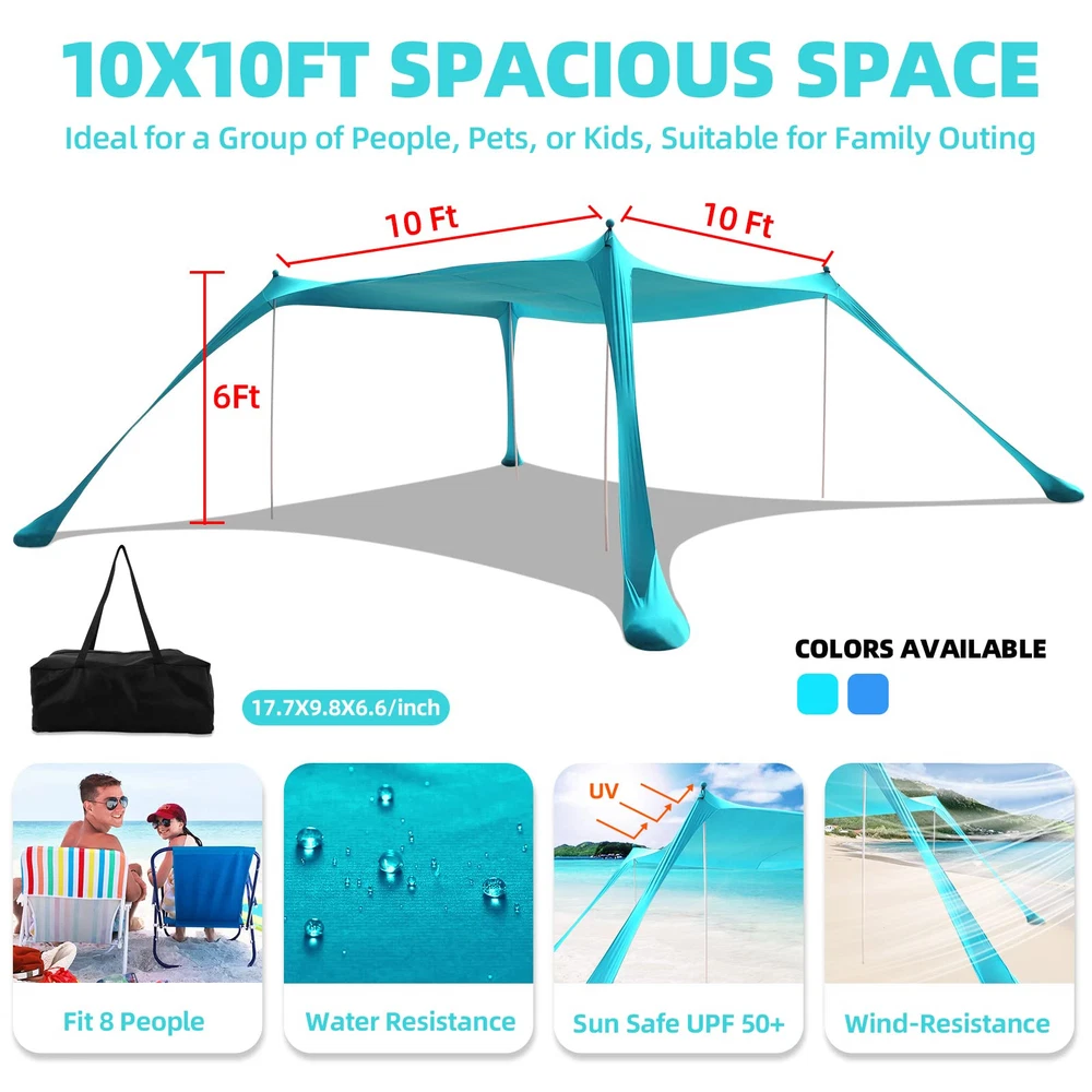 Perfect for long beach days, camping trips, park picnics, and backyard fun, the pop-up tent secures any soft, sandy ground and sets up in minutes. Pitch it on an angle for a beautiful view of the beach, or stretch it straight across for maximum space on hot summer days. No matter your need, the shade's stretchy UPF50+ Lycra fabric provides fabulous UV, wind, and rain protection. Product Include: 10×10 ft Large Beach Tent*1 7×7 ft Beach Blanket*1 Black Carry Bag*1 6.56 ft Aluminum Poles*4 Ground Stakes*8 Elastic Rope*4 Sand Shovel*1 User Manual*1 【LARGE POP UP BEACH TENT】Our beach tent sun shelter is 10×10 ft, with 4 aluminum poles up to 6.56 ft in height, thus increasing the shaded area by 50%. The poles are adjustable, you can get a 2-pole beach canopy or 4-pole beach canopy, and different usage methods get different shading areas. This beach shelter can accommodate 6-8 people. The spacious design provides a cooling shade, perfect for friends, family, and good times 【SUPERIOR PERFORMANCE, STURDY, AND DURABLE】Thickened Lycra fabric exhibit UPF 50 + ultraviolet protection performance, which can effectively block solar radiation, reduce sunburns and filter 98% of harmful ultraviolet radiation, so as to take full care of the human body. In addition, the end of the aluminum pole is a conical design, and the aluminum tube is thickened from 16mm to 20 mm. The beach shade canopy will keep you protected on both sunny and rainy days 【NEW ACCESSORIES INCLUDED】 In the same as the previous price, our upgraded beach shade set for this year adds an extra 7×7 FT waterproof beach blanket and 4 small mat pegs. The original package contains 10×10 ft beach canopy, 1-pack carrying bag, 4-pack aluminum poles, 4-pack ground pegs, 4-pack elastic rope, 1-pack sand shovel, 1-pack user manual. Just bring our beach tent set and you can go to the beach to experience a wonderful time without buying extra gear 【NOT JUST FOR THE BEACH】Where you can use our beach tent pop up shade depends on whether you can fill the sandbag, if you fill the sandbag with sand, stones, or bricks and secure it, you can use it on sandy, beach, grass, or even rocky spots. This beach tent sun shade fits couples, families, or small gatherings on the beach, grassy areas, campsites, and backyards 【RESPONSIBLE BRAND SELLER】Our beach shade tent is fully tested before shipping, and if you have any problems with the product you received, please contact us, we will take responsibility and solve all problems for you
