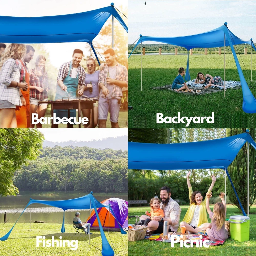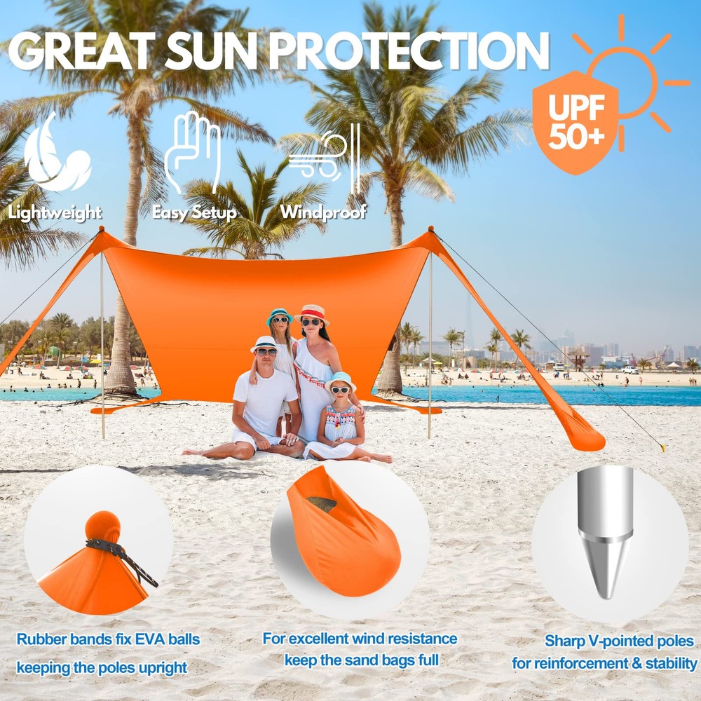 Advanced Sun Protection:The sun canopy is made of advanced stretch water-resistant Lycra fabric with great shape-no wrinkles, offering UPF 50+ sun coverage,block out harmful 98% UV rays. It can protect skin from harm by direct sunlight outdoors, and provide cool shadows,Thousands of families are using this beach sun shelter to keep their kids safe, happy and out of the sun! The Beach Tent will keep you protected on both sunny and rainy days. Sustain Stronger Wind Conditions:Did you tired of chasing blown away umbrellas and folding with clunky foldable tents? We adopted 4 sets of strength rust, bend-proof aluminum poles with a pointed stake at the bottom,unique 4 windproof ropes. Plus, the soft EVA ball at the top of each pole lets you fasten the rubber ball and shelter to hold everything even more securely. These provide a more rigid structure to the canopy, the shade is able to sustain stronger winds. Quick And Easy Outdoor Set Up: You won’t be in the sun for long time, just in minutes, you can fill the sandbags, assemble and upright the poles. At the same time, the open design on all sides allows air to flow freely under the tent, preventing uncomfortable stuffiness. And you can also enjoy the beautiful scenery on all the sides. Large Space& Adjustable: The beach sunshade tent are Large(10*10)ft can accommodate 6-8 person, Medium(7*7)ft 3-4 person. This high aluminum poles keep entire canopy area stays at full height that increasing the shaded area by 50% and accommodating more people. As the sun moves, simply move the sandbags or adjust the position of poles to change the angle of the shade for getting a perfect shadow and keep enjoying the outdoors. Super Portable&Widely Use: Comes with a portable and convenient free storage bag with a handle. you can easily fit our sun shade tent in your luggage, only 7lb, carry it anywhere without any hassle. This portable pop up beach tents sun shelter can become your go-to companion when going to the beach, park, picnic party, fishing, music festival, backyard barbecue or even in rocky camping spots.