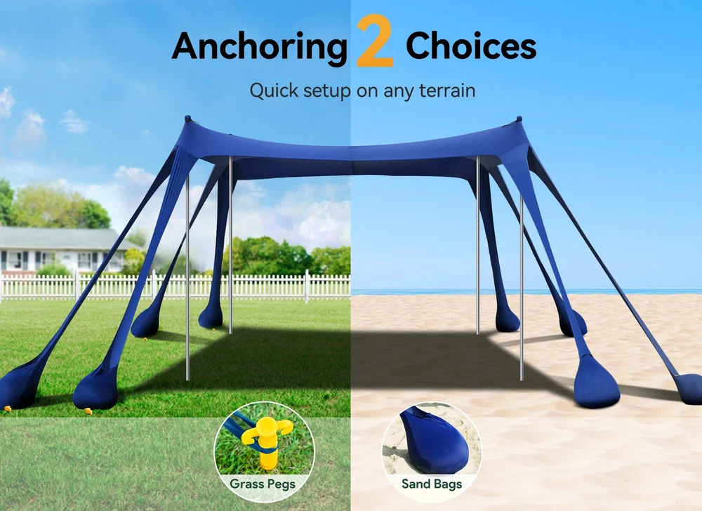 【8 Upgraded Larger Sandbags】: pop up beach tent upgraded to 8 larger sandbags (Patent NO: D980374S) and 4 thickened aluminium poles, making it 80% more stable than other beach tents. 【Quick and Easy Setup with 2 Options】: beach canopy is available in two installation methods: 4-poles or 2-poles and can be installed by a single person in 5 minutes. 【Large Size Beach Tent】: 10 x 10ft outdoor sun shelter can accommodate up to 8 people at a time, it is not only suitable for beaches but also suited for various outdoor scenes such as fishing, park outings, camping, etc. 【UPF 50+ Protection】: beach tent sun shelter is made from high-stretch lycra fabric and offers UPF 50+ sun protection, perfect for beach and outdoor use, protecting children or adults from harmful UV rays to reduce sunburn or glare. 【Light and Portable】: Weighing 8.1lbs and coming with a travel bag that fits in your carry-on luggage or car trunk, you can easily take your pop up shade tent anywhere.