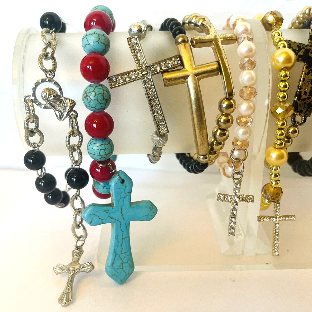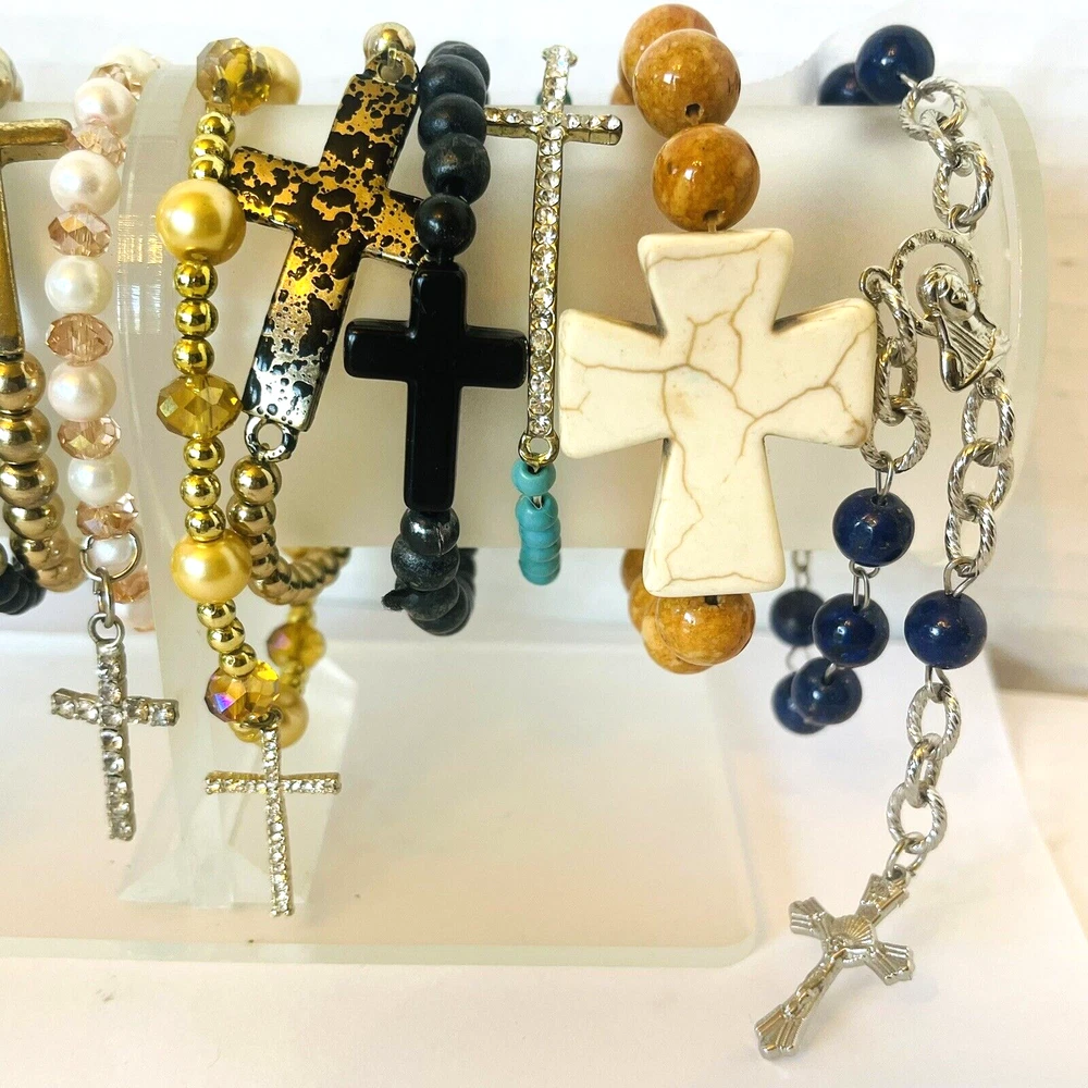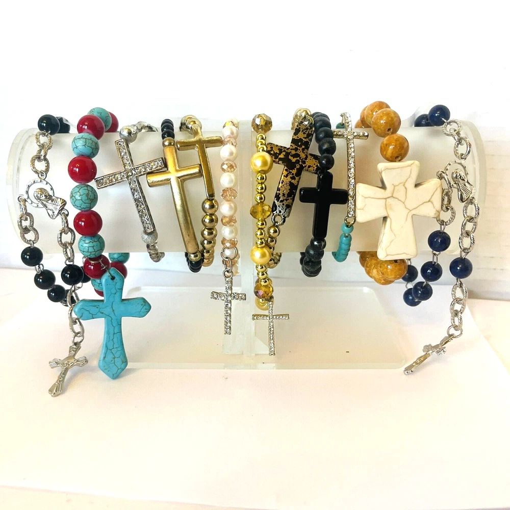 **Contact me to create custom bundles! I will discount multiple item / listing purchases + combine shipping for extra savings!** Collection of 12 bead bracelets that feature cross charms. 10 are elastic stretch bracelets & 2 are silver tone chain. Great lot for bead and charm harvest. Mix of beads include glass, stone, wood, metal, acrylic and plastic. See photos taken with ruler for more detail on size of beads and charms and added description. Beads are in good condition for bead harvest and crafting. Bracelets are wearable but age and condition of elastic varies and can not be trusted. Selling for bead harvest to make jewelry and other crafts. See photos. Zoom for more detail and assessment of condition. Feel free to contact me with questions. I will create custom bundles & give discounts for purchases of more than one item/listing + combine shipping for extra savings. Quotes provided on request. All sales are final. Returns are not accepted; however your satisfaction is important to me. Please reach out if there is a problem with your purchase. Thanks! PassionatelyCollected I passionately collect things.....