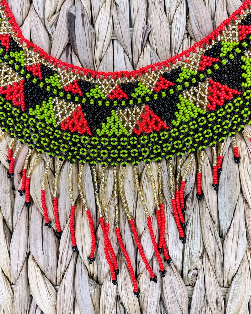 Handmade in Mexico by families in small communities. SPECIFICATIONS Size: 35-45 cm (13.7-17.7 in) x 12 cm (4.7 in) *Each beaded necklace is unique, so the sizes provided are approximate. Includes a versatile elastic hook on one end, ensuring a comfortable and adaptable fit for everyone. This necklace was crafted with elegant crystal beads and delicately woven with soft polyamide thread. CARE Store in the protective bag provided and ensuring they stay dry. Apply your lotion, makeup, or perfume before wearing the jewellery. Do not use during swimming or showering.