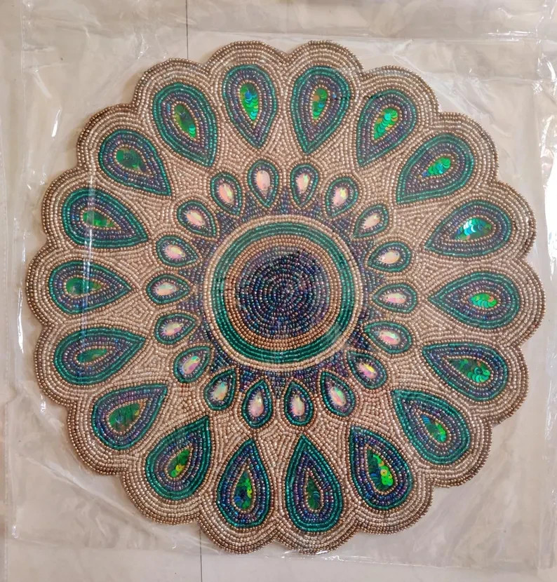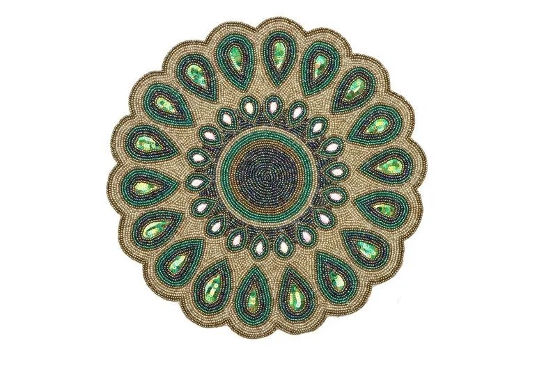 This set of 2 handmade beaded placemats features a beautiful peacock design in a mandala pattern. Made of glass, these round placemats add a touch of elegance to any dining table. Imported from India, they bring a unique and exotic flair to your home decor. Perfect for adding a pop of color and style to your dining experience, these placemats are sure to impress guests and elevate your dining setting.