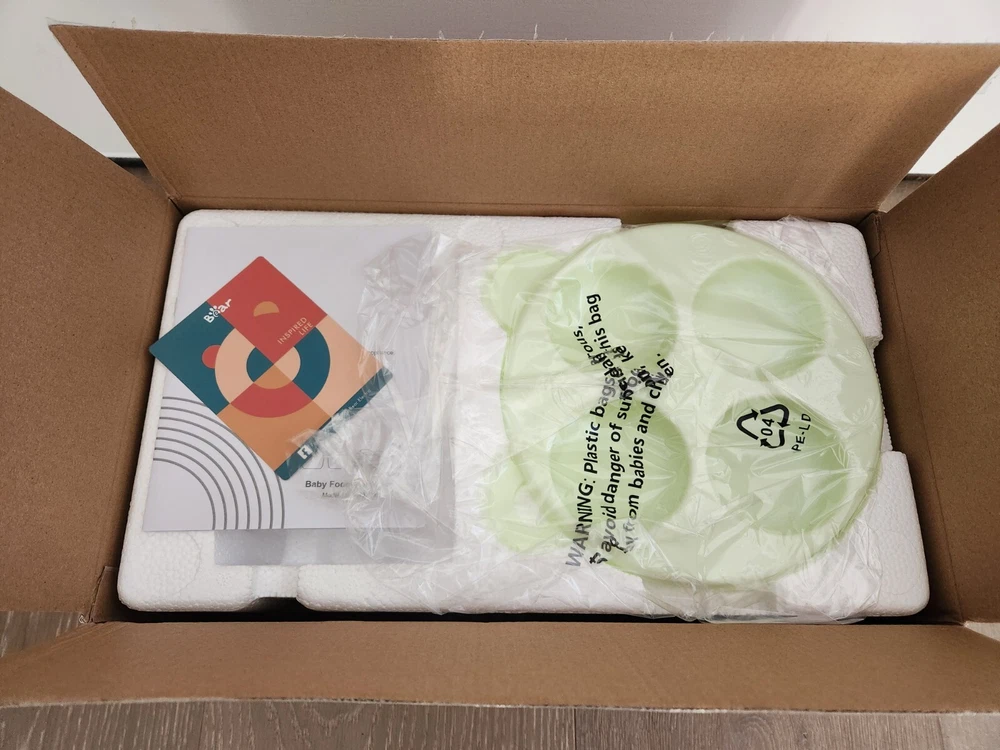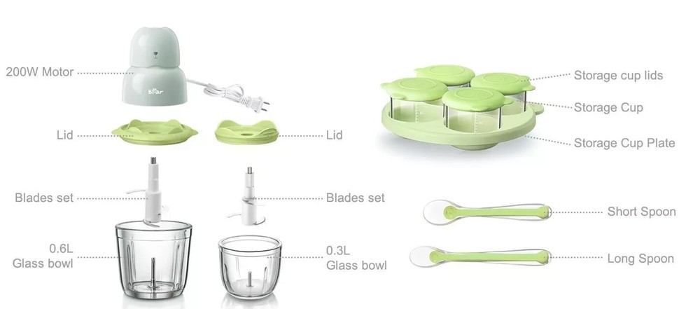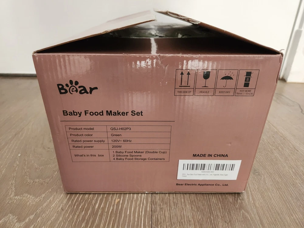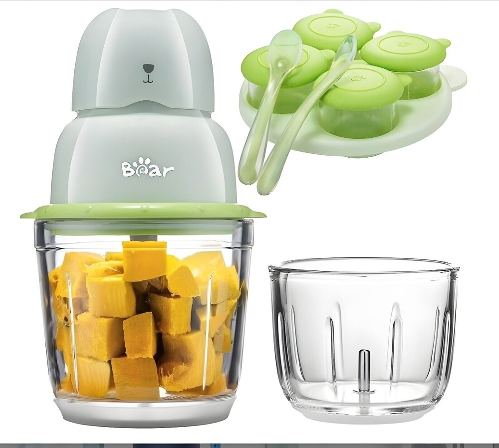 BEAR BABY FOOD MAKER SET - GREEN SAY GOODBYE TO STORE BOUGHT BABY FOOD AND HELLO TO HOMEMADE GOODNESS! This all-in-one food processor is designed to help you prepare healthy and delicious purees, juices, and smoothies for your baby in just a few minutes. Easily chop a variety of vegetables, meats, and fruits into different particle sizes according to your needs. SPECIAL FEATURES Dual-cup, Dual-blade: Featuring a distinctive dual-cup, dual-blade design. This unique feature allows for effortless separation of raw and cooked foods, ensuring impeccable hygiene and flavor retention. Whether you're blending fresh fruits and vegetables or pureeing cooked meals, our double cups and blades streamline the process, guaranteeing quick and efficient meal preparation. Easy to Use: Equipped with three sharp blades and a high-power motor, this baby food maker gets the job done in seconds. Press to start, release to stop, Make complementary foods of different consistency for your baby. The baby food maker operates quietly, allowing you to prepare meals for your baby without disturbing their nap time. Safe and Sturdy: Crafted from premium, food-grade glass bowl and stainless-steel blades, this baby food maker boasts a built-in safety lock to avert accidents. Ensuring your little one's mealtime is worry-free, it's fashioned from BPA-free materials, guaranteeing their food is safe and devoid of harmful chemicals. Easy to Clean: The baby food blender can be easily disassembled and washed. The large capacity bowl and accessories are dishwasher safe, making it easy to clean and maintain. INCLUDED What's in the Box: Bear baby food processor set includes 1 * baby food maker with 2 Glass Bowls (0.6L+0.3L), 4 * baby food containers with 1* tray, 2 * silicone spoons BRAND NEW IN ORIGINAL BOX AND PACKAGING... OPENED BOX TO INSPECT CONTENTS... GOOD LUCK!