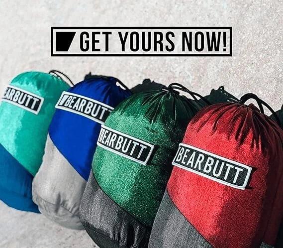 Nylon EASY TO SET UP AND TAKE DOWN - Setting up this big 10 ft long 6 ft wide camping hammock can be done in a matter of minutes, Taking down our portable hammock is just as simple. Add To Cart Now. VERY COMFORTABLE AND DURABLE - Our 2 person hammock is very durable, sturdy and has the highest quality stitching for you to spread out and enjoy your surroundings which is important for any hiking gear when backpacking. COMPACT AND LIGHTWEIGHT CAMPING GEAR - Weighing only 1.5lbs our folding packable double hammock packs up easy for storing and is small and light making it perfect to carry for any hiking trip. PLENTY OF ROOM - The Bear Butt travel hammock has so much room for Two people to fit comfortably and with a legal weight capacity of 500lbs you can enjoy time with loved ones hammock camping. Get Yours Now. THE COMPLETE SET UP - Our hammocks for camping is attached to a small compact travel bag that comes with everything you will need to be set up making ths a perfect outdoor hammock for any adventure.