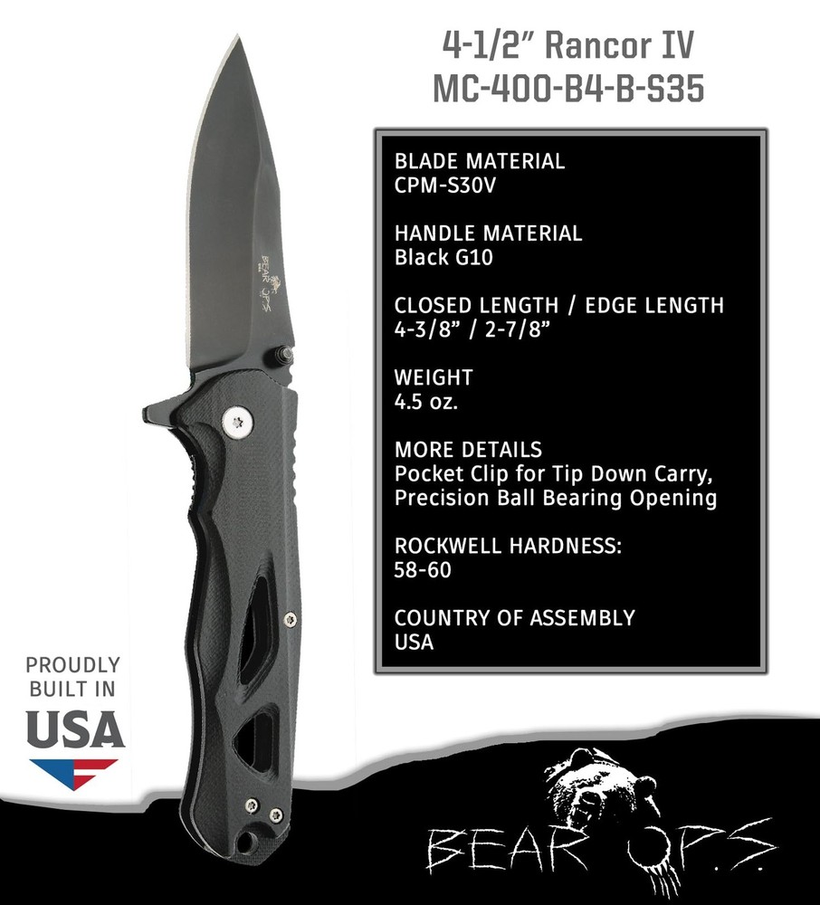 HIGH QUALITY TACTICAL KNIFE - The Bear OPS Rancor II is a high-quality tactical folding knife that features a sharp CPM-S30V steel blade, pocket clip for tip down carry, and textured G10 handle for a firm grip and easy one-hand opening. RAZOR SHARP CPM-S30V BLADE - CPM-S30V steel is a high-quality steel known for its hardness and ease of sharpening. The modified drop point blade has a thickness of .115” and a hardness of 58-60 HRC ensuring a lost lasting edge that is easy to sharpen. COMPACT AND LIGHTWEIGHT – With a closed length of 4-3/8", edge length of 2-7/8", and weight of only 4.5 oz, this knife is compact, lightweight, and a great everyday carry knife. TACTICAL DESIGN - The Bear OPS Rancor II features a lightweight G10 handle that provides great grip in the worst conditions, precision ball bearing for smooth opening, and pocket clip included for tip down carry and quick access. LIMITED LIFETIME WARRANTY - , Inc. warrants to each original purchaser of its knives for such purchaser’s lifetime, that its knives are free from any defect in material and workmanship. This knife is proudly built in the USA.