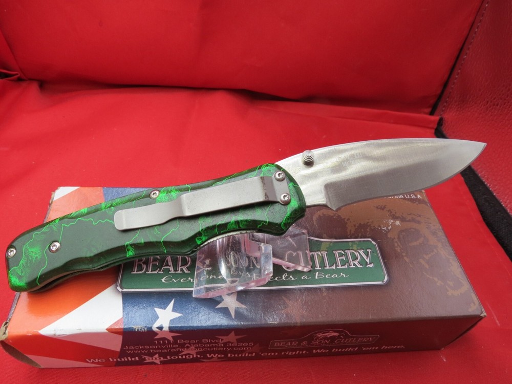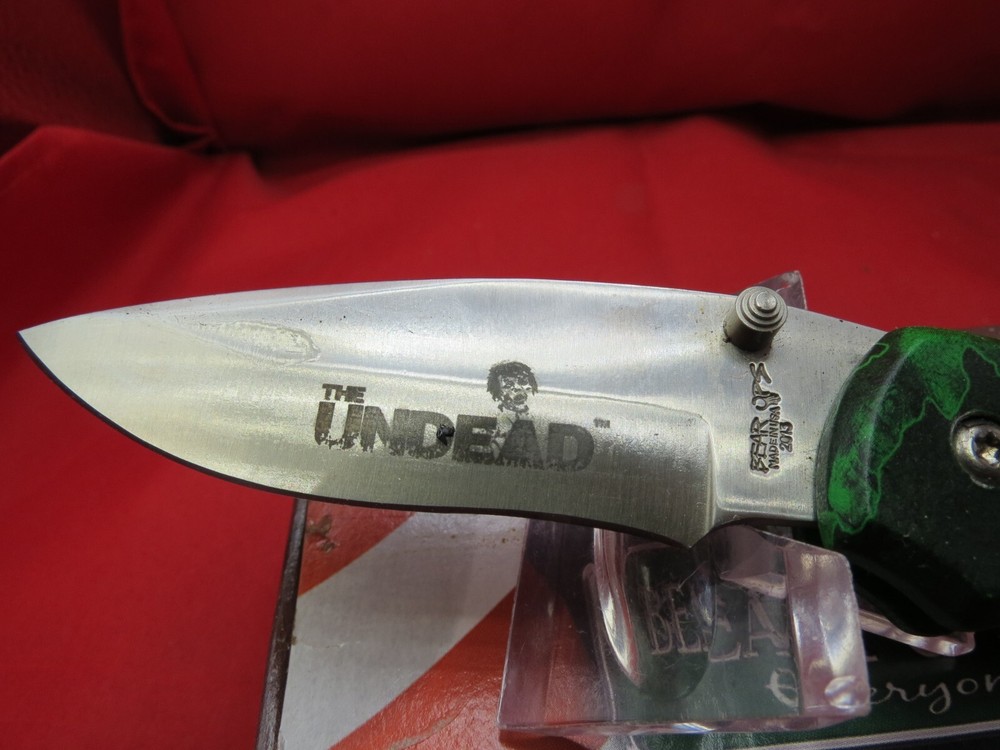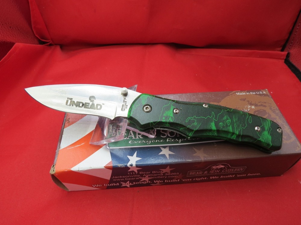 Bear OPS Rancor UNDEAD MC-100 Reaper Z Liner Lock Knife (3.5" Satin The Bear OPS Rancor UNDEAD MC-100 Reaper Z Liner Lock Knife is a high-quality pocketknife designed with a durable Drop Point blade and a manual opening mechanism. Made in the USA by BEAR OPS, this knife boasts a unique green color and features a single blade with a satin finish. The Liner lock ensures secure blade deployment and safe use during cutting tasks. The sleek design and sturdy construction make this knife a modern folding tool that is both functional and collectible for knife enthusiasts. Overall Length: 7.75" Blade Length: 3.25" Cutting Edge: 3.875" Blade Thickness: 0.11" Blade Material: Sandvik 14C28N Blade Style: Drop Point Blade Grind: Flat Finish: Satin Edge Type: Plain Handle Length: 4.50" Handle Thickness: 0.54" WE KNOW YOU HAVE A CHOICE WHERE YOU SHOP… THANKS FOR SHOPPING WITH US AT NO PRESSURE SALES,LLC PLEASE BE SURE AND VISIT OUR OTHER ITEMS Thanks for looking YOU WILL RECEIVE THE ITEM PICTURED UNLESS IT IS A MULTIPLE LISTING OR OTHERWISE STATED.ALL BONE KNIVES COME FROM BOVINE (COW) BONE UNLESS OTHERWISE STATED !!