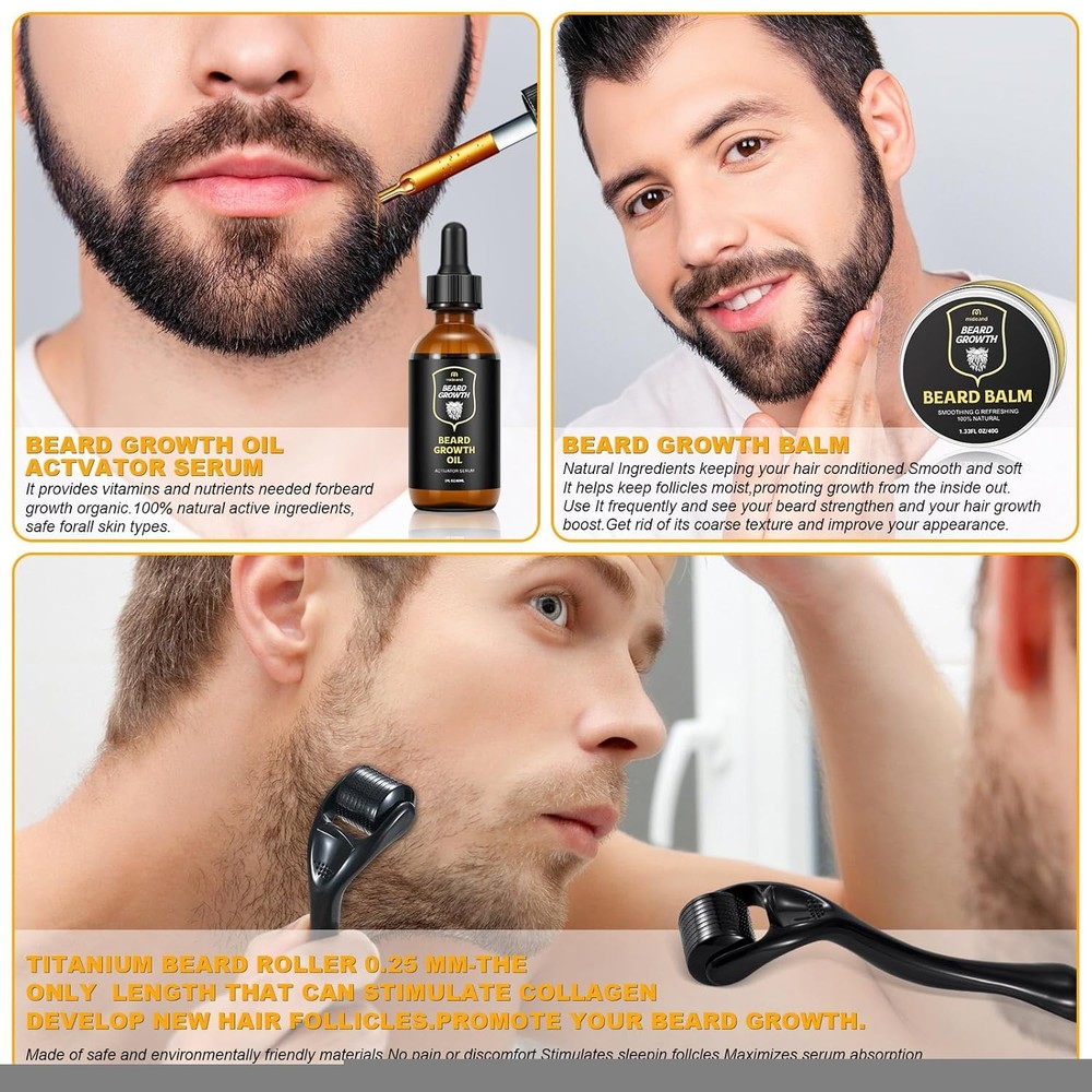 Beard Growth Kit - Beard Kit for Men, Beard Growth Oil (2oz), Beard Balm, Beard Comb, Massager for Spot/Patchy Beard - Christmas, Anniversary, Birthday Gifts for Men, Dad, Husband, Boyfriend Description Looking for a gift for the man who has it all? The beard kit is a standout choice for those who take pride in their grooming and premium beard kit delivers a complete solution for achieving a fuller, well-defined beard. With its fast-absorbing beard oil that fills in patchy areas and enhances density, combined with a soothing beard balm and precision sandalwood comb for effortless styling, this kit transforms your daily routine into an indulgent grooming experience. Experience a remarkable transformation as your beard becomes noticeably thicker and more robust with regular use. Perfectly crafted for men who take pride in their appearance, it not only boosts confidence but also makes an exceptional gift for any special to Use The Beard OilRecommended use: For best results, use the beard oil daily on an ongoing basis.1. Clean your face thoroughly2. Distribute 1-2 drips in the palm3. Apply the oil with circular movements onto the desired area. 4. Leave in The Beard Oil and allow it to fully to Use The Beard BalmRecommended use: 3-4 times a week depending on your beard need.1. Take a small portion on your palm2. Rubbing with palms3. Apply on your beard4. Massage with your fingers to spread well for better absorptionDual Teeth Beard CombOur handmade comb made of natural solid wood, which is both sturdy, comfortable and unscent, not only does it have anti static properties but also make for long lastingLinen Beard Storage BagThe beard travel pouch is made of reusable linen. You can put all the beard grooming tools you have in the storage bag for easy to take on the road. Or just keep an extra kit in the office. Features: Achieve a Thicker, Healthier Beard Effortlessly - Our expertly crafted beard oil is designed to deeply nourish facial hair, helping to reduce patchiness and promote a fuller, stronger beard. The lightweight, non-greasy formula absorbs quickly into the skin without clogging pores, ensuring a smooth and refreshed feel. Elevate your grooming routine with a beard that looks denser, healthier, and effortlessly well-maintained. The Perfect Grooming Gift for Him - This premium beard care set is an ideal gift for any man who takes pride in his appearance. Featuring a nourishing beard oil, a styling balm, and a precision-crafted Sandalwood comb, it provides everything needed for a well-groomed and stylish beard. Whether for a birthday, anniversary, or holiday, this thoughtful gift enhances his grooming routine and boosts his confidence. Deep Conditioning for a Soft, Itch-Free Beard - Our all-natural beard balm works to deeply condition and tame unruly facial hair while hydrating the skin beneath. It absorbs quickly, reducing itchiness and beard dandruff, ensuring long-lasting comfort. Paired with a handcrafted, anti-static Sandalwood comb, this set helps distribute natural oils evenly for a refined and polished beard. Thoughtful & Practical Gift for Every Occasion - Designed for men who take their beard care seriously, this grooming kit makes an excellent gift for husbands, boyfriends, fathers, or friends. Whether it’s for a special occasion like Father’s Day, Christmas, or a simple gesture of appreciation, this kit provides a premium self-care experience that any bearded man will appreciate. Premium Packaging for Home & Travel Convenience - Elegantly packaged in a sleek, travel-friendly gift box, this beard grooming set is designed for both home and on-the-go use. Its compact yet complete design ensures that every man can maintain his beard effortlessly, whether at home or while traveling. Give the gift of style, convenience, and confidence with this all-in-one grooming kit. Product Details: Package Dimensions : 6.42 x 5 x 2.4 inches; 9.91 ounces Item model number : Beard-Kit-011 Manufacturer : Mideand Product Benefits: Detangling Hair Type: All Scent: Tea Tree Liquid Volume: 2 Fluid Ounces Item Form: Oil Handling We will ship all orders within 3 business day of payment. Delivery We Do Not Ship Outside of the Continental US. Return Policy All items qualify for returns within 30 days of receipt. Buyer is responsible for return shipping on any item that is not damaged. Feedback We take our reputation seriously, we buy and sell online, so we understand the value of trust. If you are unsatisfied with your order, please contact us and we will work with you to resolve it to your satisfaction.
