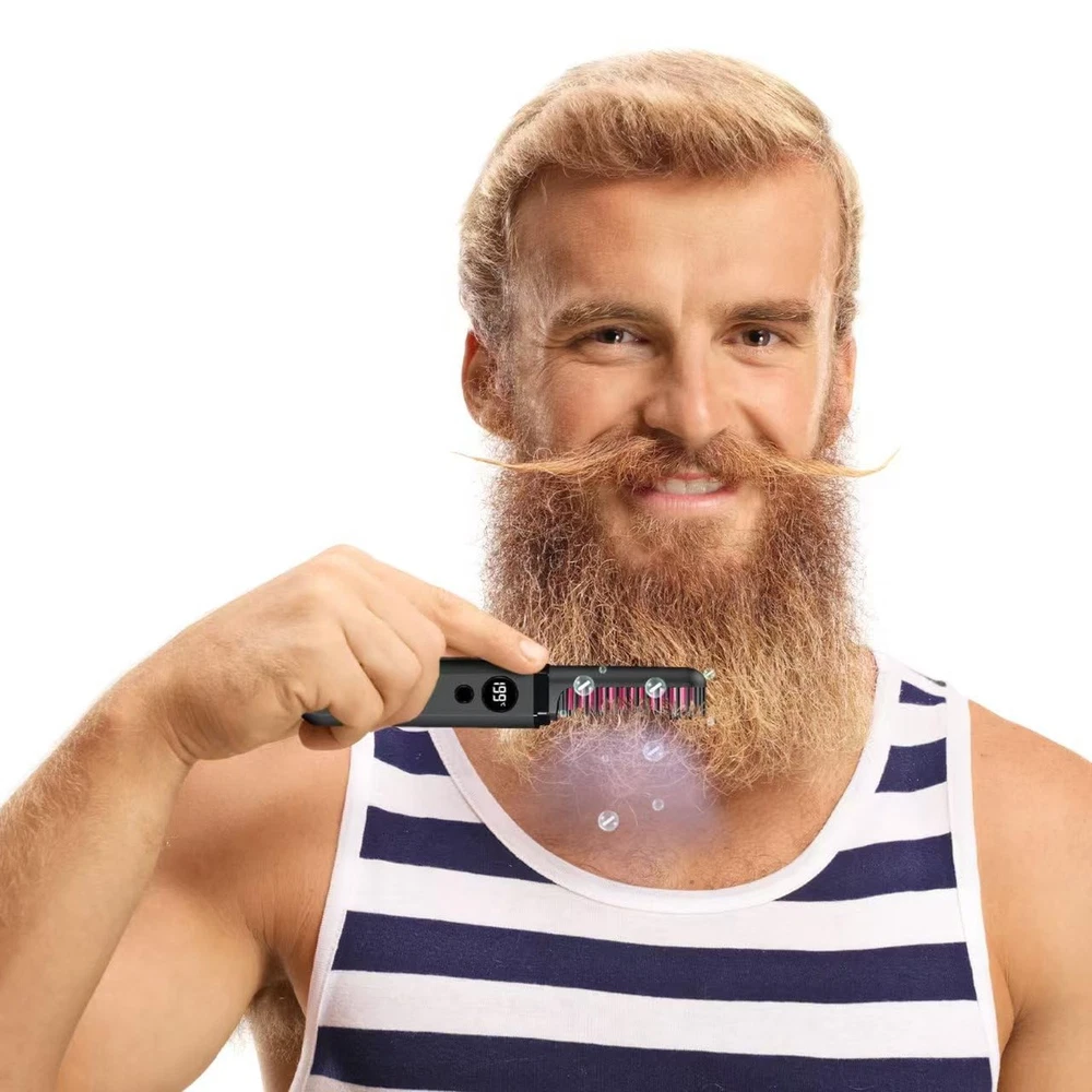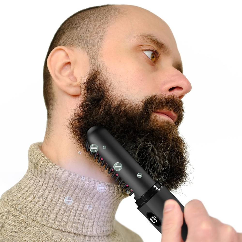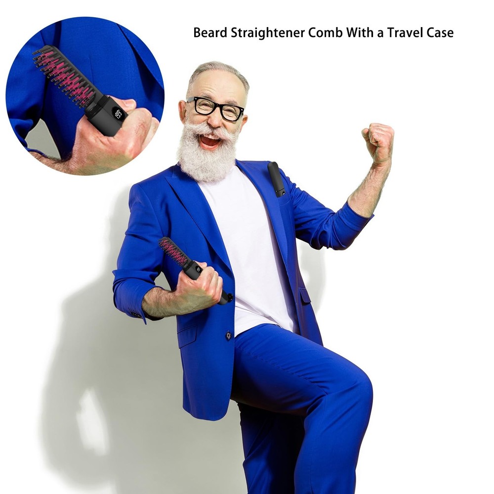 Beard Straightener for Men, Heated Beard Brush, Cordless Beard Hot Comb for Medium to Long Beards, with Travel Case, Rechargeable, 3 Temp Settings, Ionic Technology, Grooming Gift for Men(Black) Product Details Brand: JDHAVMOS Color: Black Material: Aluminum, Iron, Plastic Power Source: Battery Powered Included Components: Comb Product Dimensions : 8.86 x 1.38 x 1.18 inches; 6.38 ounces Batteries : 1 9V batteries required. (included) Date First Available : December 20, 2024 Manufacturer : JDHAVMOS Best Sellers Rank: #257,524 in Beauty & Personal Care (See Top 100 in Beauty & Personal Care) #330 in Beard & Mustache Combs #330 in Beard & Mustache Combs Customer Reviews: 4.4 4.4 out of 5 stars 27 ratings Gifts for Men with BeardsThis beard straightener brush is specially designed for facial beards and is ideal for beard styling.Beard Straightener for Men, Grooming for Frizz-Free & Split-Ends. Negative Ion Heated Beard Comb This beard straightening brush combines advanced ion conditioning and an anti-static coating, making facial hair combing smoother, reducing tangles and frizz, with quick and long-lasting effects. It makes your beard and hair feel soft and smooth. Temperature-Controlled Beard StraightenerThis cordless beard straightener uses the temperature locking function to set the most suitable temperature for your beard. The cordless beard straightener for men is equipped with an LED display, and you can easily adjust the appropriate temperature.If the device has not been used for 20 minutes, it will automatically turn off. Portable Beard Straightener for MenThis cordless beard straightener for men comes with a comb-toothed protective case, which is convenient for travel and home use. beard hot combs has a built-in 5000mAh rechargeable lithium battery, which can meet your daily needs. Note This beard straightener is only compatible with a 5V/2A adapter!(Don't use it while charging)