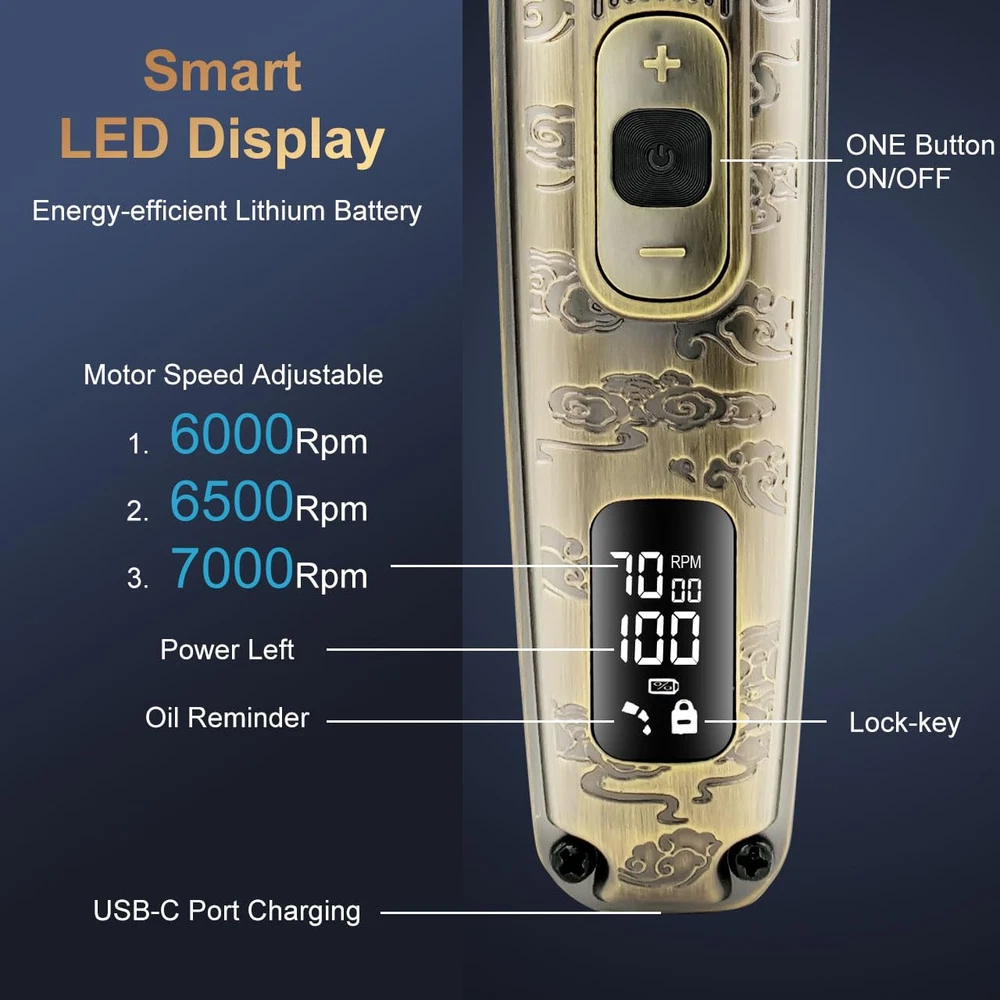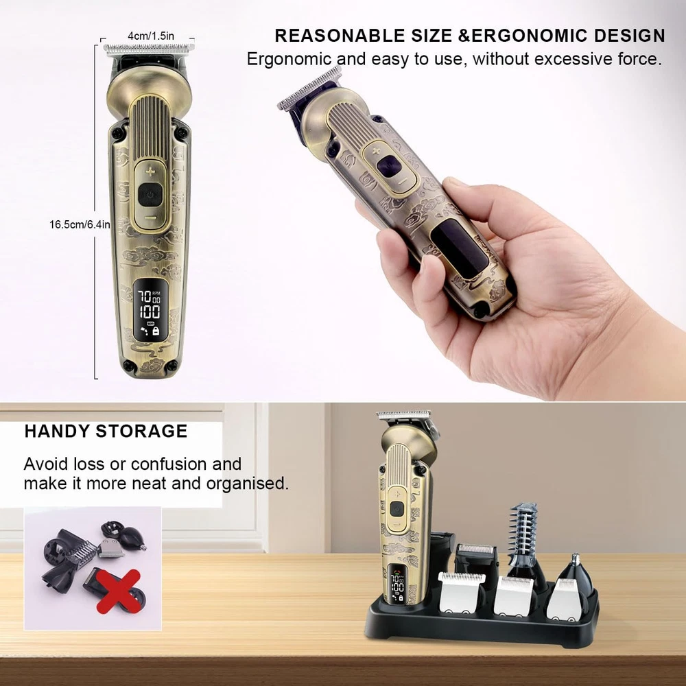 【8 IN 1 Versatile Grooming Kit】Equipped one T-blade trimmer with 4 guide combs (1 mm, 3 mm, 5 mm, 7 mm), one hair trimmer with 7 guide combs (3 mm, 6 mm, 9 mm, 12 mm, 15 mm,left/right comb),one precision trimmer(1-10mm dial comb),one detailed trimmer,one micro razor, one nose/ear trimmer, one body groomer, one body hair trimmer head,designed for men for all ages seeking convenient grooming solutions,suitable for novices as well as professional barbers and stylists. 【Up to 7000 RPM Adjustable Speed】Resistant motor with a standard speed of 6000 RPM, which can be increased to 7000 RPM in the speed control mode for cutting harder hair or fast trimming, and ensuring a neat and straight edge . The motor stands up to frequent use, runs smoothly, delivers a trimming without pulling or snagging,and is less prone to overheating and wear. 【Smart LED Display & USB-C Charging】Reminds you when trimmer is fully charged or low battery state. Reaching full power in 90 minutes provides 180 minutes of trimming. Enjoy the convenience of cordless grooming with USB charging ,while the C-port ensures compatibility across multiple models, eliminating charger mismatches and loss concerns. 【Precise Length Control】 Choosing different lengths from 11 Guard Combs (1mm, 3mm, 5mm, 7mm for T blade head; 3mm, 6mm,9mm,12mm,15mm,left comb/right comb for hair clipper head) to achieve precise cuts and trims with for various hair lengths and hairstyles. With 1 PRECISION DIAL from 1mm-10mm effortlessly customize your desired look. 【Ergonomic design】Can be gripped and trimmed for a long time, not easy to cause wrist fatigue, comfortable to operate, making precise trimming more simple every time; Compact size for easy to carry ,it can be used for men's daily trimming, but also can be used for travelling or business trips, with a locking function to avoid accidental switch on. 【Entire Body Washable】 The Beard Trimmer body adopted IPX6 waterproof design with the removable cutter heads for easy cleaning under running water. For longer use, please dry it after cleaning. 【Ideal Choice of Men's Beard Trimmer Set】Multiple blades and different sizes of combs are plentiful without being cluttered, and comes with a handy storage bag and storage stand for easy storage of all accessories and for carry to go ,also avoids loss or confusion, making your beard trimmer set more tidy and organisedand . This beard trimmer kit would be a good souvenir for your dads, loved ones or male friends on your day of commemorations or other special days.