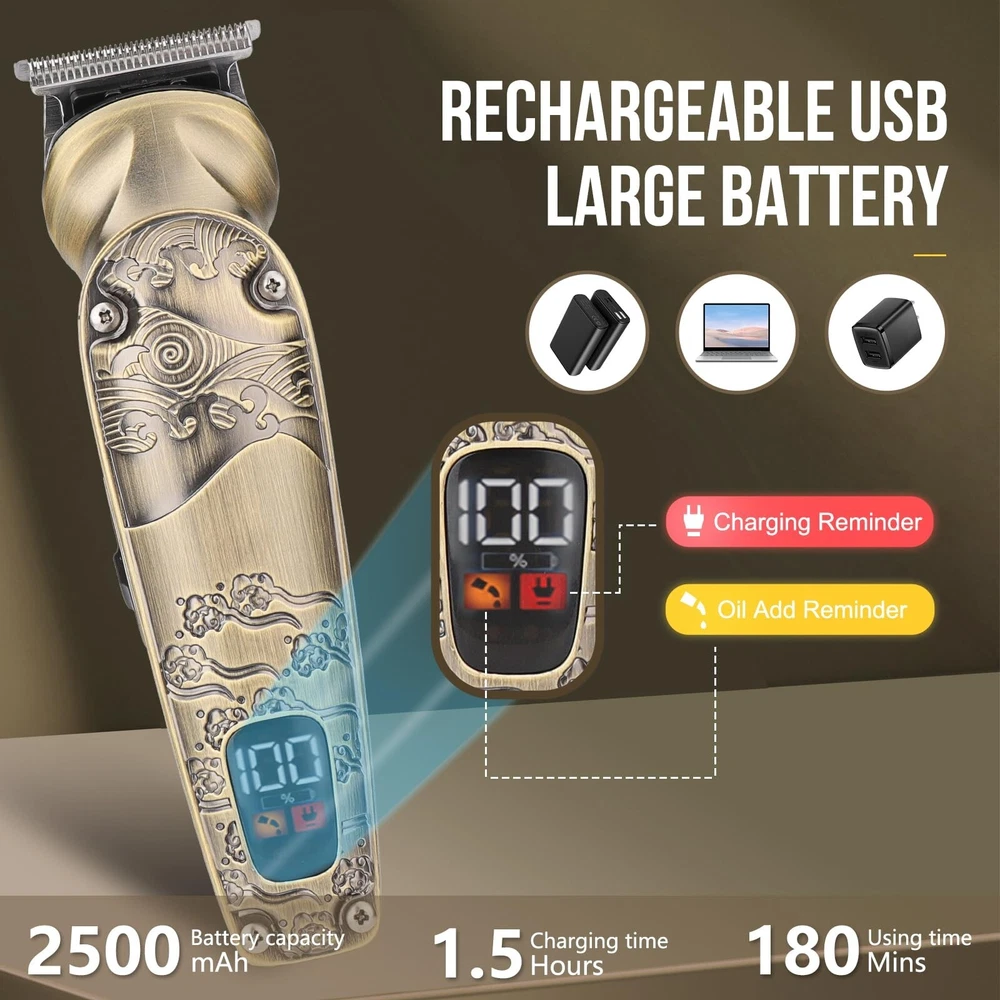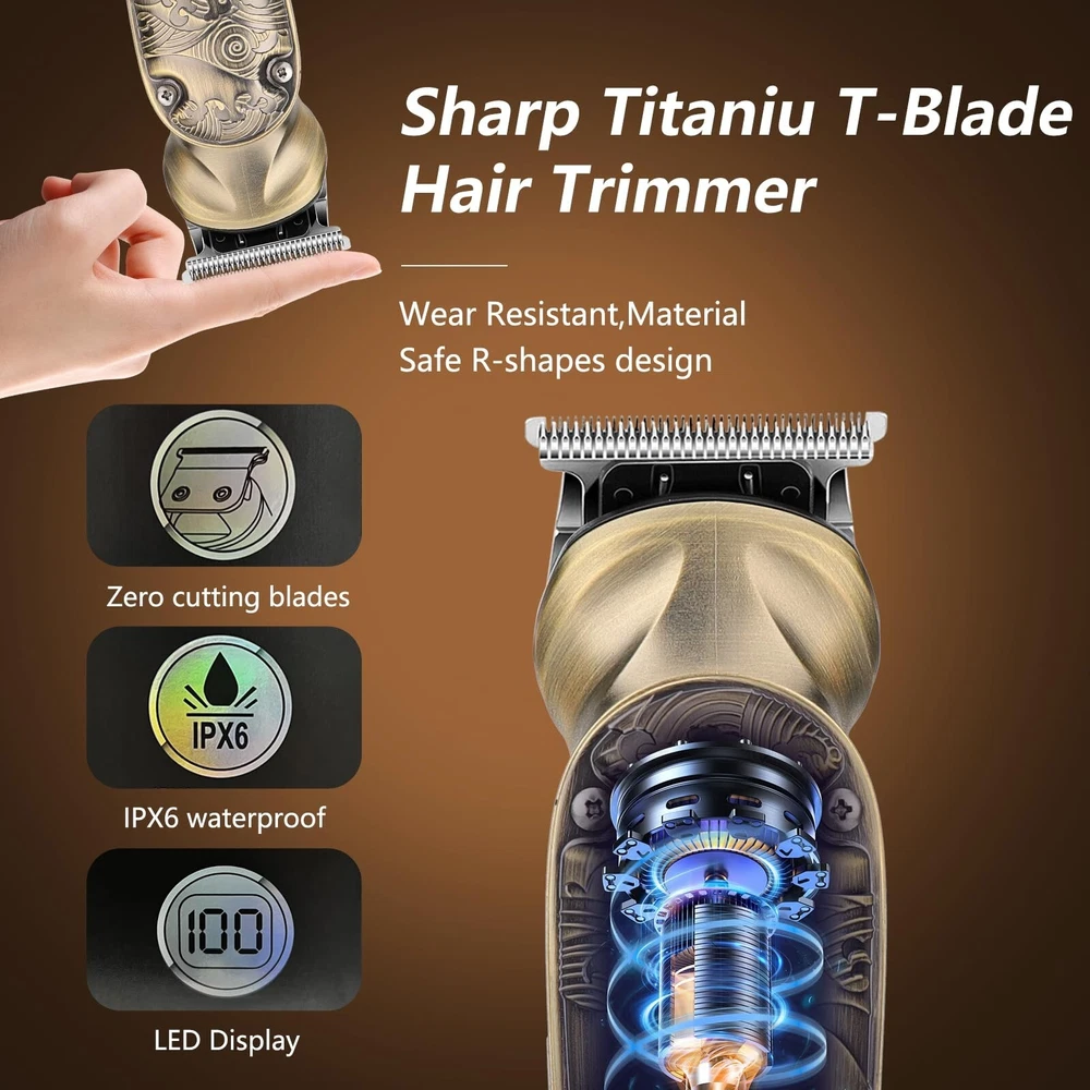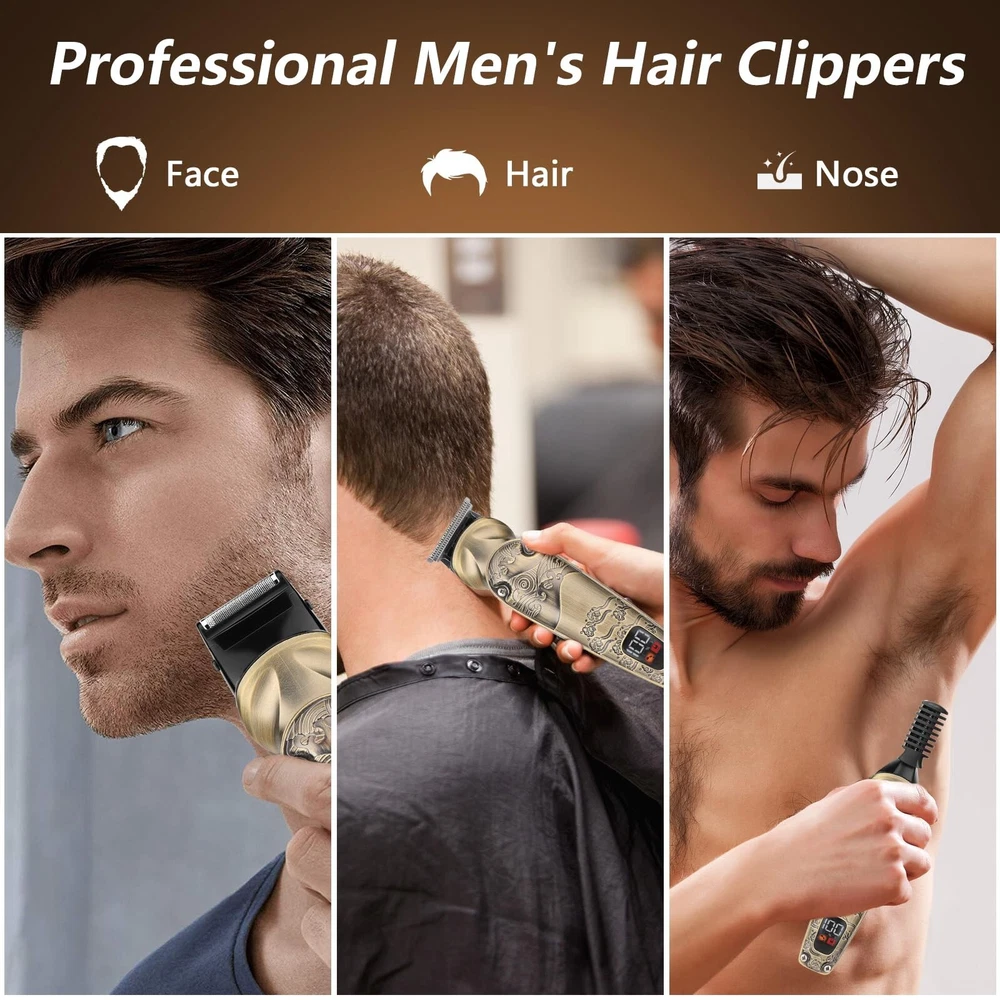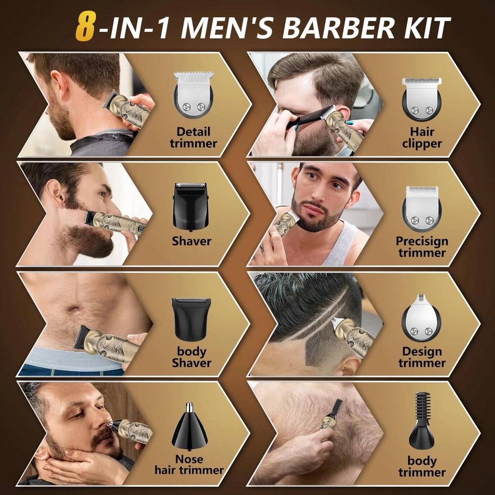 Beard Trimmer for Men, 8 in 1 Waterproof T-Blade Hair Clippers, Cordless Hair Clipper Trimmers Set, Electric Razor Shavers for Men, LED Display, Grooming Kit for Nose Mustache Body Facial Men Gifts Product Details Recommended Uses For Product: Nose Color: Bronze Hair Type: All Item Weight: 0.67 Kilograms Brand: Bomxin Package Dimensions : 9.09 x 6.34 x 3.03 inches; 1.48 Pounds Batteries : 1 Lithium Ion batteries required. (included) Date First Available : August 24, 2024 Manufacturer : Bomxin Country of Origin : China 8-in-1 Multi-Grooming Kit: A professional multi-functional grooming kit specially designed for men. A one-stop solution for men's beard, body hair, nose hair, ear hair, facial hair and more. Easily shave off short hair or stubble and complete facial and body trimming Powerful Motor, Sharp Blades: This beard trimmer has a 6800 rpm, powerful but quiet motor. It does not get hot when in use. Sharp high carbon steel blades ensure smooth cutting on all types and lengths of hair, including thick hair. The blades are precision ground to stay sharp longer without pulling on the hair Led Display And Usb Charging: The Men's Hair Trimmer battery provides a long-lasting trim for up to 180 minutes on a 90-minute charge, and the electric shaver kit supports USB-C charging with an LED display showing the battery level. You can charge the Men's Hair Trimmer with any compatible cable or directly from your laptop or mobile power Removable And Washable Blades: The blades are removable, washable, and can be removed for quick hygienic cleaning by simply rinsing the blades under running water. The Men's Grooming Kit includes grooming accessories, from guide combs of different sizes to a variety of trimmer attachments, each of which is just what you need Exquisite And Compact, Comfortable To Hold: All-metal body with non-slip skeleton and on-the-go use. Hanging T-blade cuts while shaving, clipped hairs are easy to clean and won't build up. Suitable for greasy hair, sculpted, vintage hairstyles, bald, you can give it as a birthday gift, Christmas gift, Father's Day, Valentine's Day gift to your loved ones