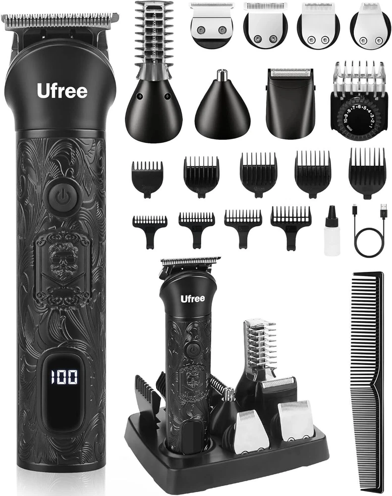 Charging Time 14 days Battery Description Lithium-Ion Included Components Trimmer Runtime 1 hour About this item MULTIFUNCTIONAL SHAVING KIT FOR HEAD TO TOE USE - The all in one barber clippers include 7 trimmer heads, 10 hair combs and a base. Covers all hair cutting tasks, from hair, face, beard, nose, ear, body and pubic area. Surprise your husband or any special man in your life with the perfect gift. HIGH BATTERY LIFE AND RECHARGEABLE - The men's electric razor has a built-in lithium battery that provides 2 weeks of trimming sessions on its 60-mins, plus a cordless design and LCD display, all of these are essential for use when traveling. EXCELLENT TRIMMING ABILITY - The steel blade of the hair trimmer is sharp enough to allow you to cut more accurate, its sharp blade can easily cut through fine, heavy hair/mustache without slowing down or pulling. The clippers for hair cutting with T liner blade can achieve zero gap, liner and edger. ULTIMATE MANSCAPE GROOMING PERFORMANCE - With a motor that speeds up to 6500RPM, the beard kit delivers a quiet and efficient shaving experience. R-shaped 360°skin-friendly obtuse edge of blade provides a quick, safe trim without any skin irritation. Easy to clean the blade by rinsing under water.(Note: please don't immerse the whole trimmer in water) HIGHLIGHTS - Metal body, great steampunk look, gorgeous and unique. Add 3 more beauty accessories: 1 trim head and 2 adjustable guide combs. An improved switch button for ease of use.