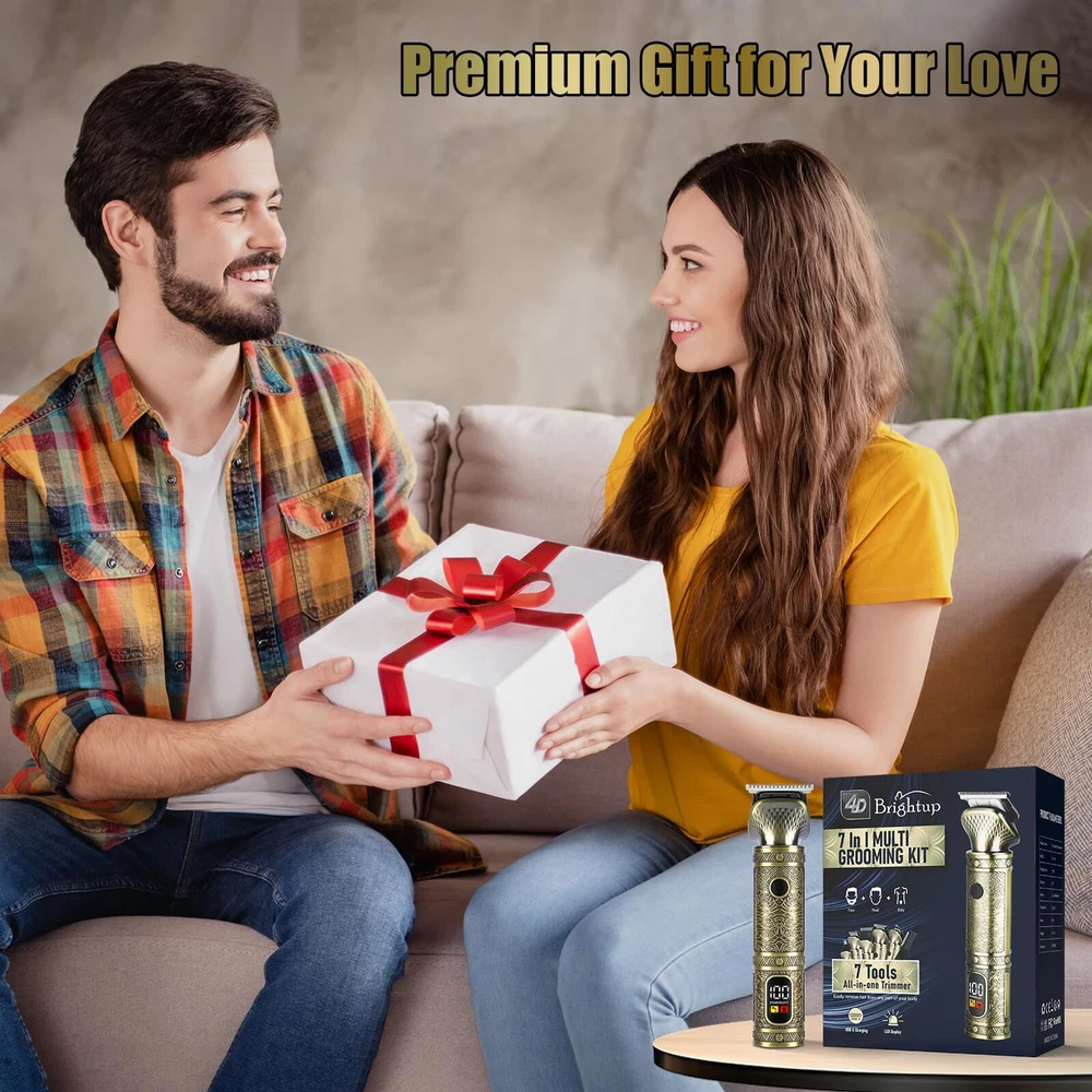 All in One Mens Trimmer: It has 7 trimmer heads, a T blade edgers, 2 in 1 cutting head to trim hair and beards, a foil shaver, a nose hair trimmer, a body hair trimmer for men, a precision beard trimmer and a design trimmer. Shaving Kit for Men: Beard grooming kit men also come with 9 guide comb sizes for different hairstyles and lengths. 4 hair guards 1/3/5/7 mm, 4 guide combs 3/6/9/12 mm, a durable stand and storage pouch for travel. The interchangeable multiple heads are for trimming face and neck, mustache, sideburns, stubble, body hair and facial hair. Ultra Sharp Steel Blades: The electric razor for men face delivers an even, precise, close shave and clean cut; its sharp blades can easily cut through fine, thick, coarse hair without pulling or snagging. The T blade liners can be close to the skin for a zero-gap trim and can do hairlines or edges. Useful LED Display: This cordless hair trimmer for men haircut has a digital display that can constantly shows the remaining battery life to let you recharge the beard and mustache trimmer. Rustic personal mens grooming kit is a versatile tool to shape and trim different areas of body. USB C Rechargeable & Long Battery Life: This hair clippers for men cordless built-in lithium battery provides wireless operation for up to 120 mins after 1.5 hrs of charge. Included a USB C cable but wall adapter is not included. Easy to Use and Clean: The portable body/facial grooming clippers set is ergonomic, ensuring a comfortable grip and effortless to use. Wash the stainless steel blades by rinsing under water.(Note: Don't immerse the whole electric hair trimmer in water). Gifts for Men: The men's hair clippers are a solid pick for a complete grooming experience. Perfect for personal use or as a stylish gift for your fathers, dads, and husband. Give it as a christmas gift or birthday gifts to your family and friends.