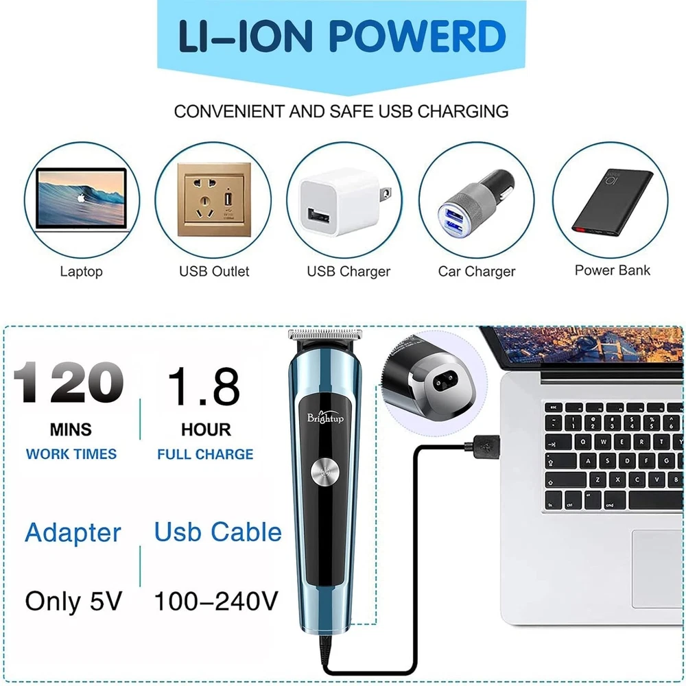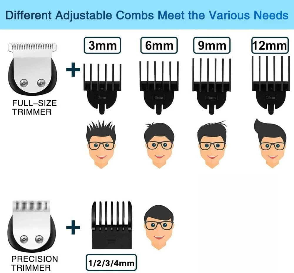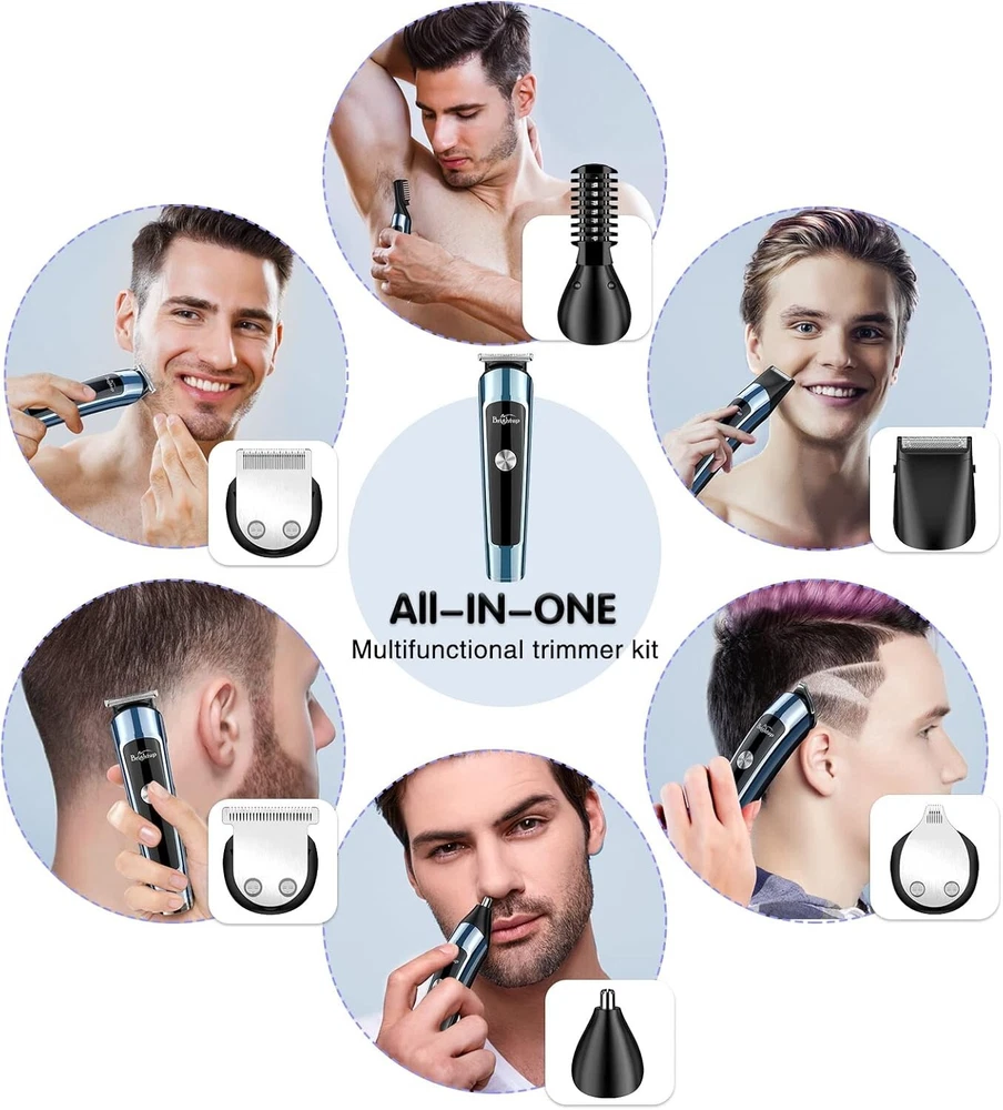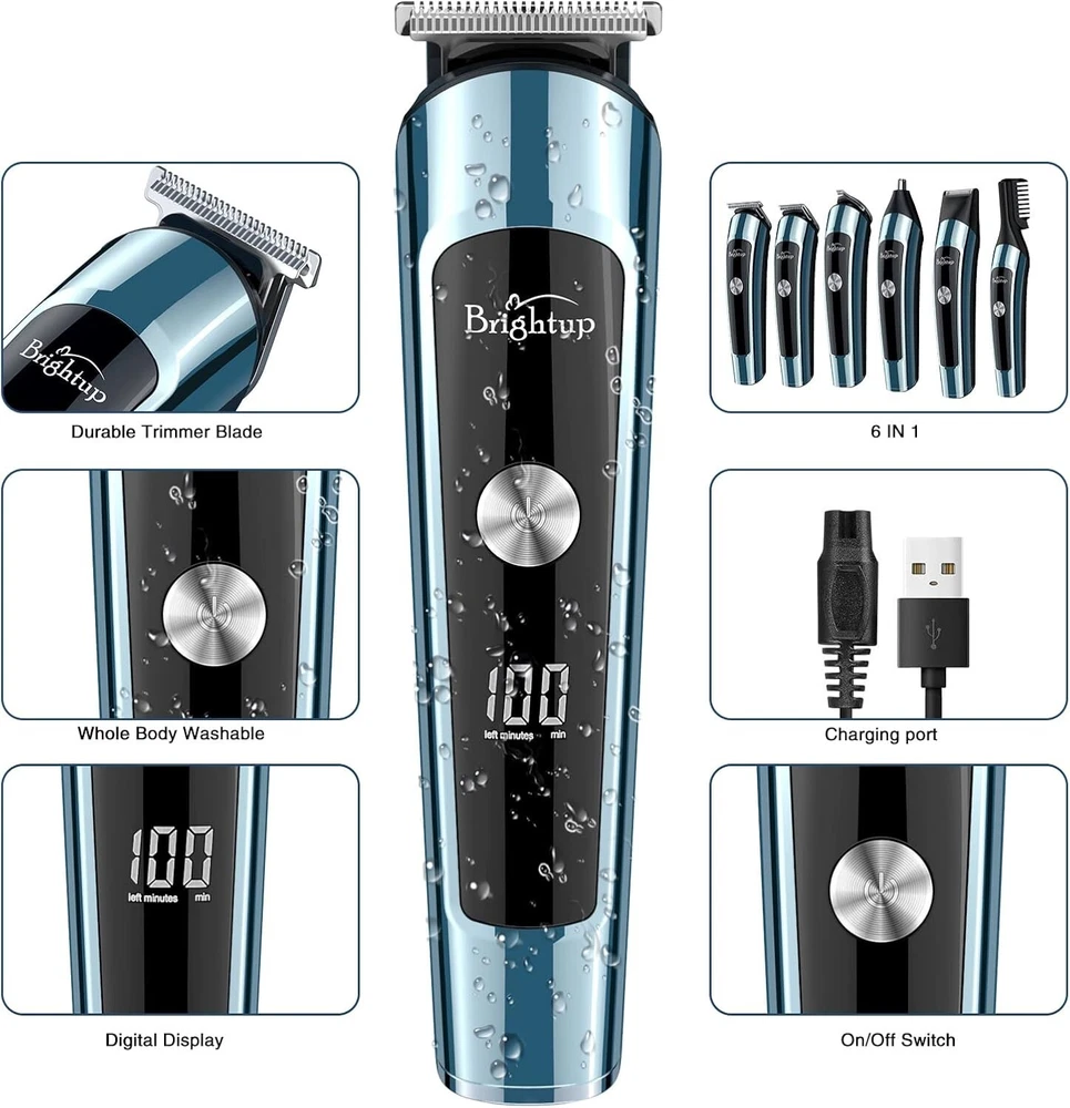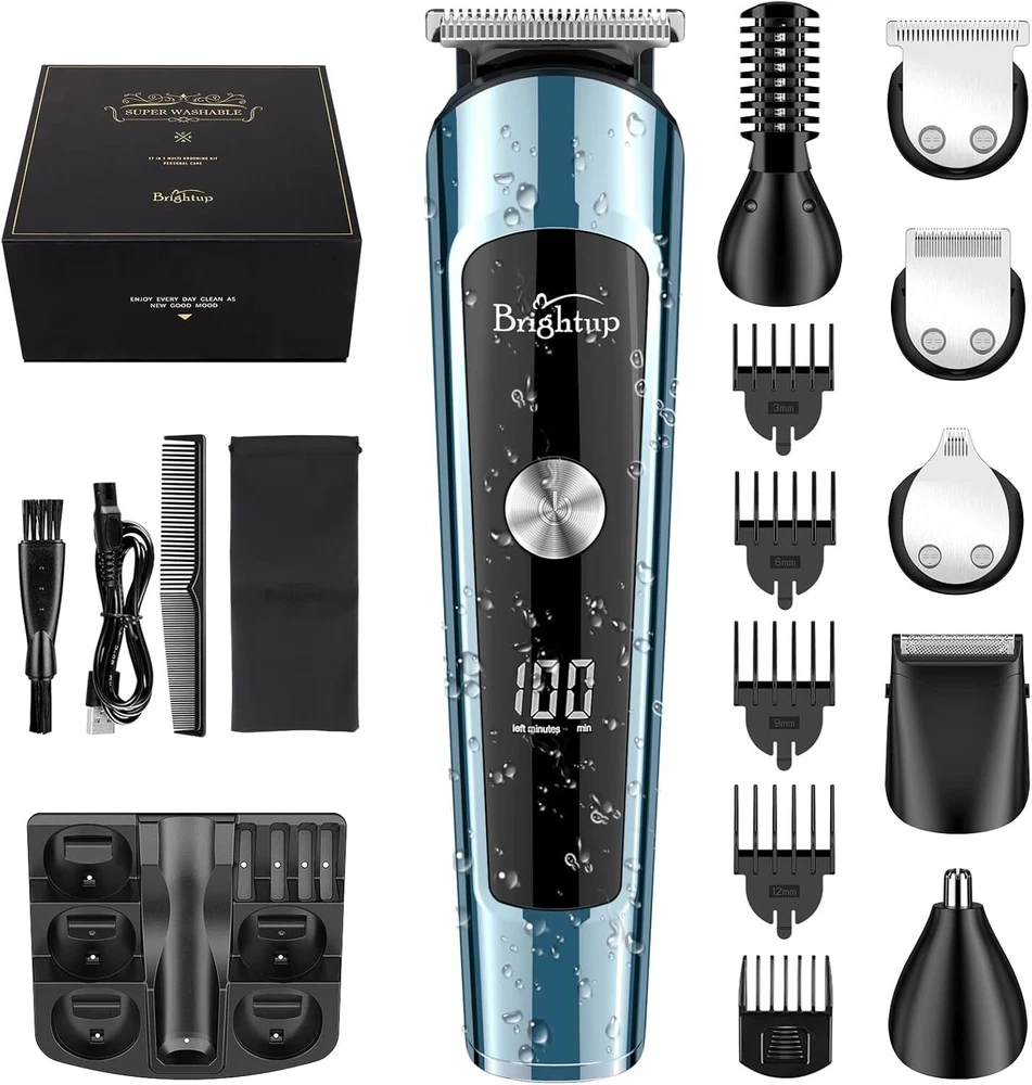 Brightup Beard Trimmer for Men, IPX7 Waterproof Mens Grooming Kit with Cordless Hair Clippers, Electric Razor with LED Display, Shavers for Mustache, Body, Face, Ear, Nose Hair Trimmer, Gifts for Men About this item [Multi-Functional Beard Grooming Kit & Ergonomic Design] The Multifunctional beard trimmer kit includes 6 trimmer heads, a stand base and leather storage bag for easy storage. The smooth curved handle makes it easier and more comfortable to hold. It has a 3 second long press lock design that helps to use the trimmer better. The cordless function makes it easily portable. [Whole Body Washable & Precision Control] The trimmer is waterproof and can be washed easily after every use. The trimmer also comes with 6 hair trimmer combs which helps with precision control. It can be used to control length of the hair, styling of beard, body, private, mustache, nose, ear, facial, leg or groin. [2 Speed modes & Self sharpening] The trimmer also has 2 speed controls and helps to cut different thickness of hair. 8000 RPM is suitable for daily use whereas 10000 RPM helps cut thicker hair easily. The stainless steel blades can be easily sharpened and are non-corrosive and prevents skin irritation. [LED Display & USB Fast Charging] The trimmer has a rechargable built-in Lithium-ion battery. It provides up to 120 minutes of run-time when charged for about 1.8 hours. It has a bright LED display which indicates battery power. It also provides an indicator to charge when the battery is low. [Detachable & Multiple Use] The design is made such that the whole body is washable and is made for easy cleaning. The blades are detachable which makes it easy to clean. The high-quality motor makes the trimmer noiseless while running. It comes with a magnetic box design which makes it as a perfect gift to be given to your loved ones. [Gifts for Men & One-Year Warranty] High-end magnetic box design, embedded EVA sponge, is the best gift for men, father, husband, boyfriend and son. It has everything you need for a quality haircut and a great styling kit for men for a hassle-free grooming experience at home or on the go.