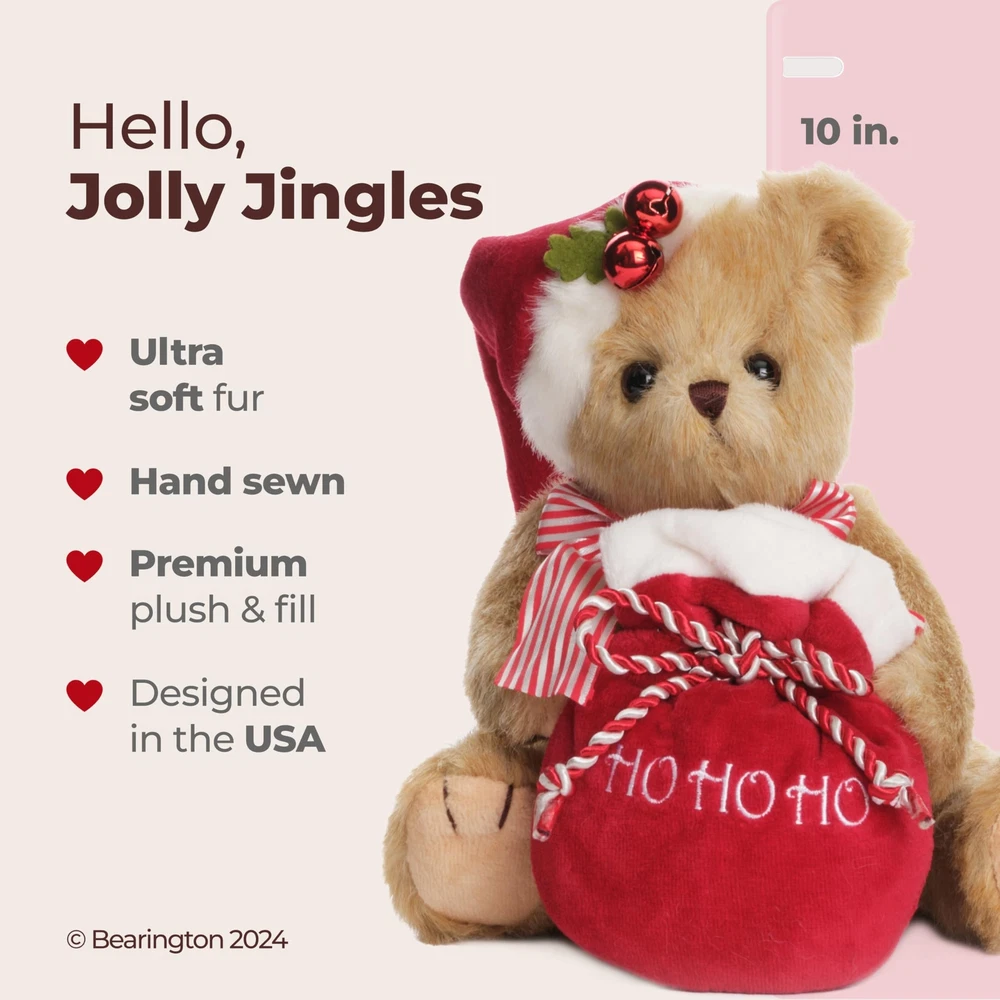 You will love the fine detail award winning uses to bring Jolly Jingles, the teddy bear, to life. Hand crafted using the most luxurious, soft plush, this bear makes the perfect gift or addition to your holiday décor. Soft and pose-able, Jolly Jingles will make the perfect companion. Founded in 1997, Bearington is the proud recipient of more distinguished design awards than any other teddy bear company. Over the years, Bearington has received more than 100 industry design awards and nominations which include: 1 Canadian Collectible of the Year Award, 2 NALED Plush of the Year Nominations, 2 CIB Collector’s Choice Awards, and several TOBY Industry Choice Awards, TOBY Public Choice Awards, and Golden Teddy Awards and Nominations. Meet Jolly Jingles: Jolly Jingles, our delightful teddy is a festive treat for this Christmas. At 10” tall in a Santa outfit and eyes sparkling with joy, this Christmas teddy embodies the holiday spirit. Crafted as an ultra-soft friend, Jolly Jingles Christmas teddy bear offers a of snuggly memories. You'll love these Christmas stuffed animals for . Cuddly: Experience the of Christmas bears with premium plush and soft fur, crafted with excellent craftsmanship. These adorable bears are perfect for adding festive warmth to your holiday décor, combining high-quality materials with attention to detail for a truly special Christmas companion. Holiday Gift: These Christmas teddy bears make adorable gifts for both girls and boys, perfect for cuddling and creating endless happiness. With Bearington, Christmas is even more magical. Choose Christmas bears as your ultimate Christmas stuffed animal, making it a heartwarming Christmas gift that can be treasured all year round. Bearington Quality: Bearington is a synonym for luxury and quality in the realm of stuffed animals. Our brand, recognized globally, offers the finest Christmas teddy gifts for . Each Christmas Bear is custom-designed and meticulously crafted, ensuring an impeccable Christmas stuffed animal every time. Award-winning Toys: Experience the of Christmas with Bearington's award-winning, children's favorite plush toys. Celebrating over 25 years, we're excited to introduce our enchanting Christmas line. Featuring adorable Christmas bear plush for , such as the rosy-cheeked snowman toy and the always-loved Christmas bears.