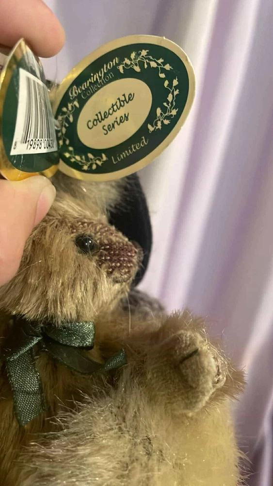 This is a Bearington bear. He is not suitable for children under 5. His hat doesn't come off at all. His glasses move a little bit, but don't fully come off. The little bear is sewn to his chest, so the big bear's sweater doesn't fully come off. The front of the big bear's pants is sewn to his belly, so the pants don't fully come off either. There is a hole in the back of his pants, for his tail. His head, right arm, and both legs rotate 360-degrees. However - the right arm only does that if you take off the sweater; and the legs only do that if you take off the pants. He is 14 inches tall, his shoulders are 7 inches wide, and his belly is 4 inches thick.