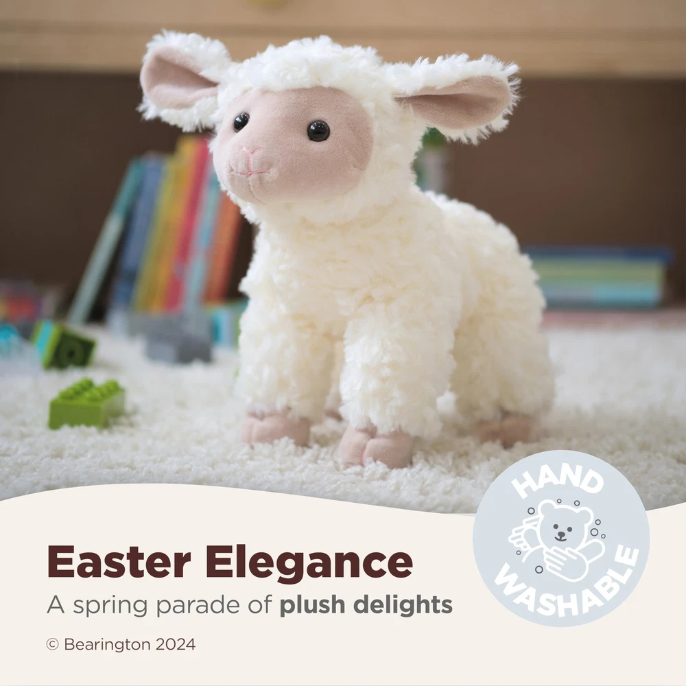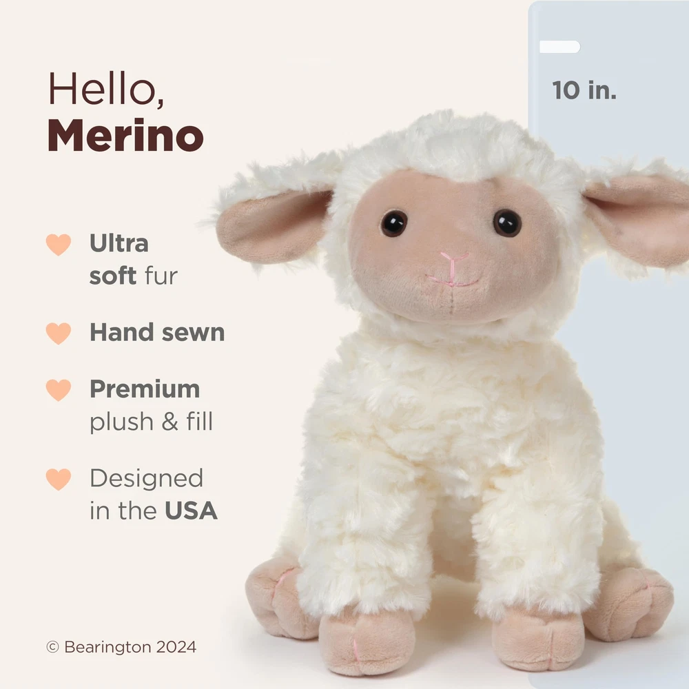 You will love the fine detail award winning uses to bring Merino, the plush lamb, to life. Hand crafted using the most luxurious, soft plush, this baby sheep is perfect for everyone from the collector to a special in your life. Floppy and cuddly, Merino will make the perfect companion. Measures 10" long from nose to tail and 9" tall standing. Founded in 1997, Bearington is the proud recipient of more distinguished design awards than any other teddy bear company. Over the years, Bearington has received more than 100 industry design awards and nominations which include: 1 Canadian Collectible of the Year Award, 2 NALED Plush of the Year Nominations, 2 CIB Collector’s Choice Awards, and several TOBY Industry Choice Awards, TOBY Public Choice Awards, and Golden Teddy Awards and Nominations. ADORABLY CUTE: This 10" Merino stuffed lamb plush toy that can be positioned sitting or standing is an adorably cute addition to any baby's toy collection. With ultra soft fur, sparkling eyes and floppy design this plushie is sure to bring joy and comfort to your little .This stuffed lamb is surface washable, making it easy to keep clean. You can have this snuggled up in a crib with a safe inner bean bag weighted paws make this plush lamb a cuddly huggable friend. SOFT & CUDDLY: This stuffed animal lamb provides a comforting, calming effect for young children. A perfect companion for anyone in need of a cuddle. Delicately stuffed for ultimate softness, it is huggable and cozy, making it good for babies, toddlers, teenagers, and adults alike. Its plushy texture is sure to provide comfort and warmth, making it great in a bedtime snuggle session. This plush lamb provides comfort and warmth to children, promoting feelings of and well-being. COLLECTIBLE QUALITY: This Lamb plush stuffed animal is made from soft, high quality premium materials and is handcrafted to perfection. It is a wonderful addition to your annual holiday decorations, and timeless keepsake,capturing the essence of Easter and the joy it brings to children of all ages. With its attention to detail and superior craftsmanship, this toy is a must-have for any collector. Whether you're looking for a special gift or just want to add a touch of class to your own décor. A SPECIAL GIFT: Delightful design and cute features make it a fantastic addition to any Easter-themed gift or decoration. This adorable plush lamb is an ideal present for baby showers, Christenings, Baptisms, Easter and more; this surely brings a smile to their face. Suitable for little girls, boys, or stuffed animal sheep lovers of all ages. The thoughtful and unique nature of this gift will surely make them feel loved and appreciated. BEARINGTON QUALITY: Outstanding brand known worldwide for its custom-designed, luxurious fabrics and craftsmanship.The brand, part of the award-winning , is synonymous with luxury, elegance and attention to detail, making it a popular choice among those who appreciate high-end products. Whether you are looking for a plush stuffed animal lamb or a cozy blanket, Bearington offers products with outstanding quality that ensures long-lasting durability and a pleasant touch.