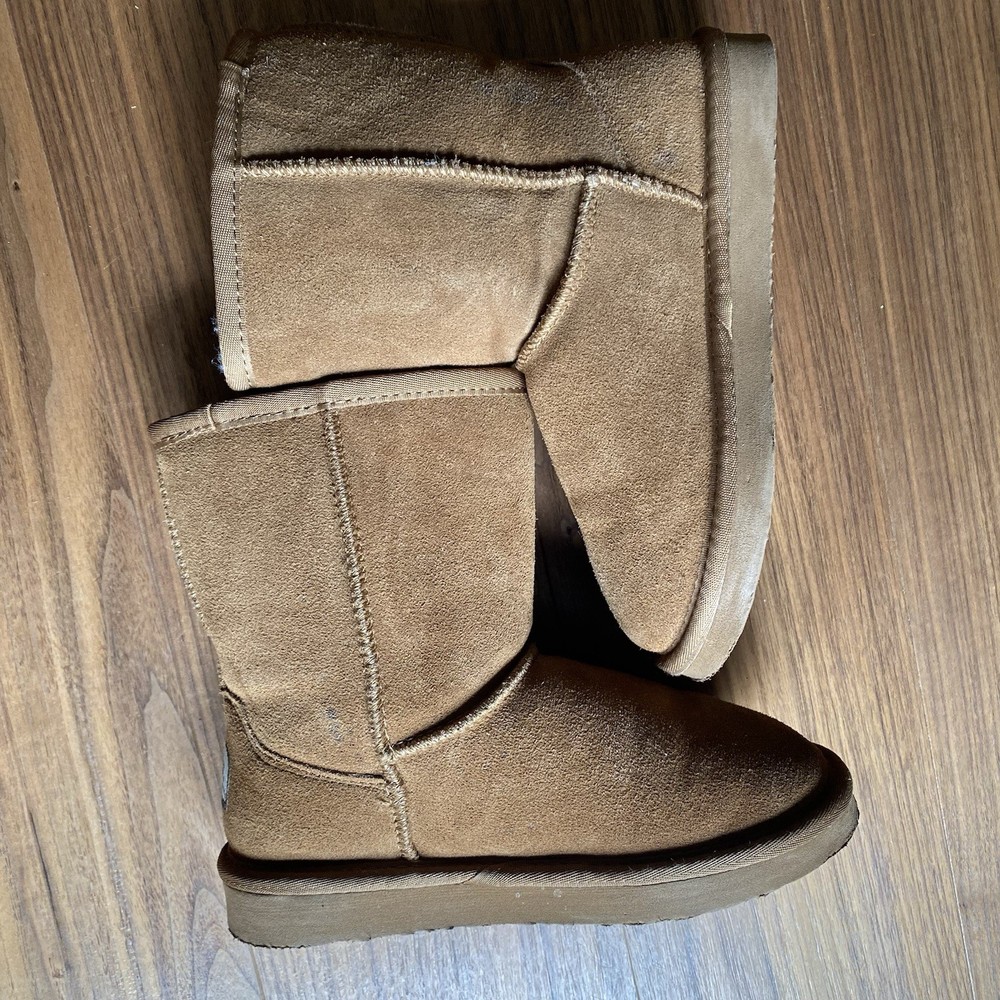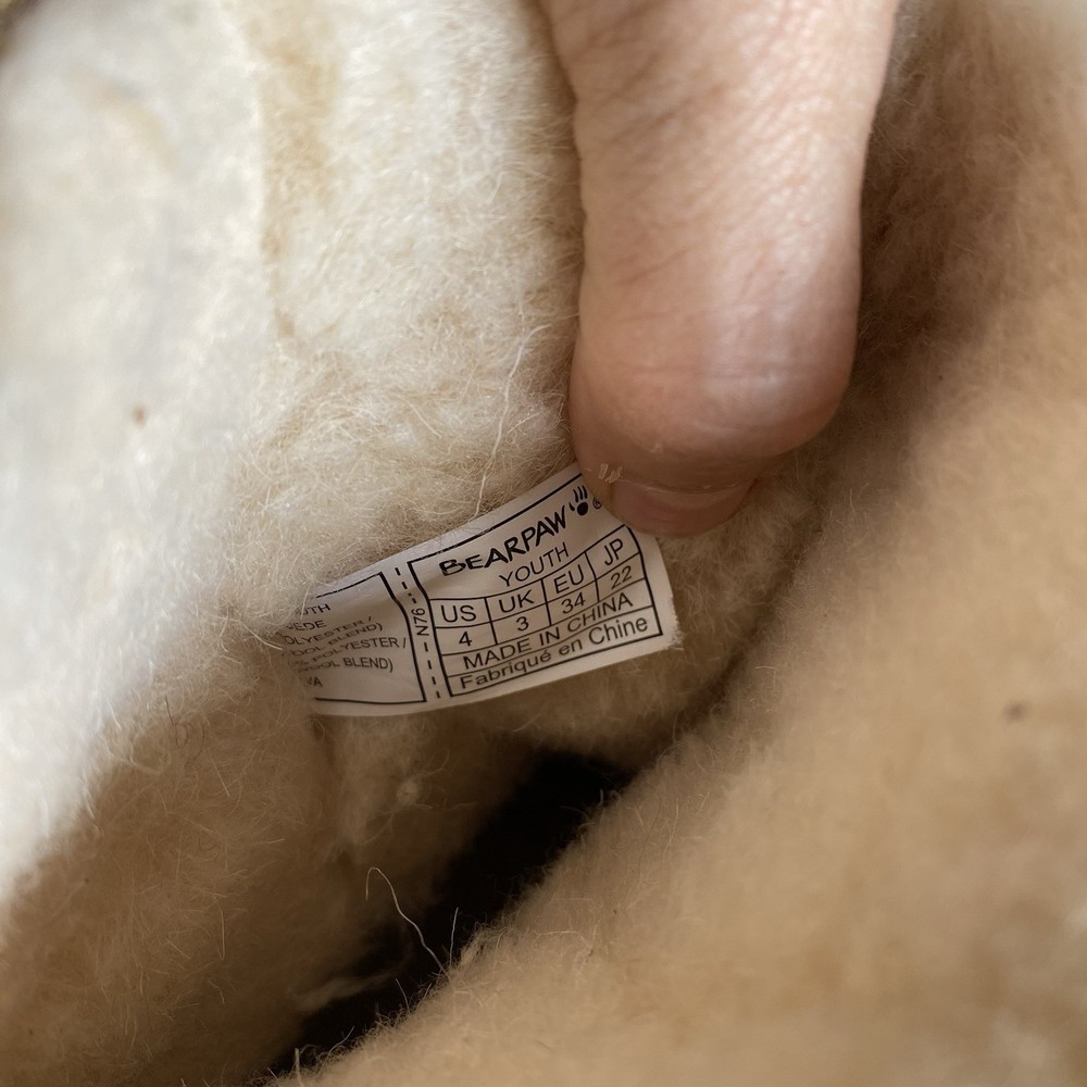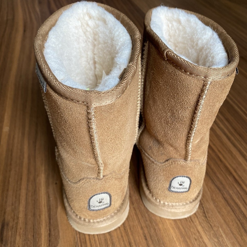 Stay warm in these cozy Bearpaw Youth 4 winter boots, featuring a genuine suede upper and plush wool-blend lining. Classic pull-on design, perfect for cold weather, school, outdoor play, or everyday wear. Features: • Size Youth 4 (fits approx. Women’s 5.5–6) • Chestnut/Tan suede upper • Wool-blend / faux shearling lining • Traction rubber outsole with BEARPAW logo pattern • Pull-on style • Comfortable, warm, and durable Condition: • Good used condition • Minor wear on suede (light marks visible in photos) • Soles show moderate wear but still plenty of life • Clean interior • No major flaws, tears, or holes