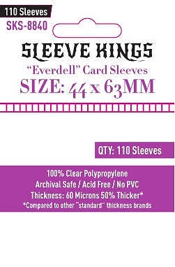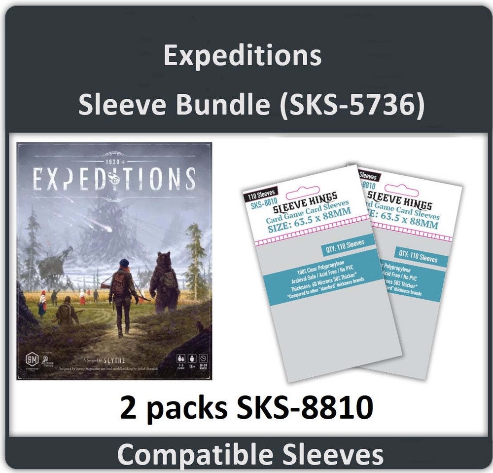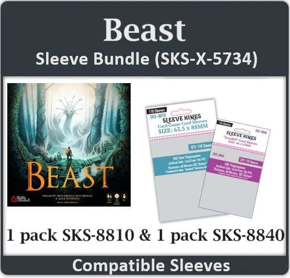 This is all the sleeves for the game " Beast" Compatible Card Sleeve Bundle (8810 X 1 + 8840 X 1) *Thicker than any other "Standard" Sleeves- Most "Standard Sleeves are 40 microns thick, a few are even 50 microns. Ours are 60-microns thick! That is 50% more than most! *10% more sleeves than the other guys -Most sleeves come 100/pack. We are the only brand offering 110 per pack! 10% more FREE! Note we have calculated the number of packs for this bundle based on THIS page from BGG. ** Note Game Titles and their intellectual property rights are © and TM of their respective rights holders, no challenge to these rights is expressed or implied. Compatibility claims only extend to the physical size of the cards in each respective game and no claim to endorsement or authorization by the respective rights holders is expressed or implied by Sleeve Kings. Our products are compatible with the respective games only and all rights are reserved by the respective rights holders.