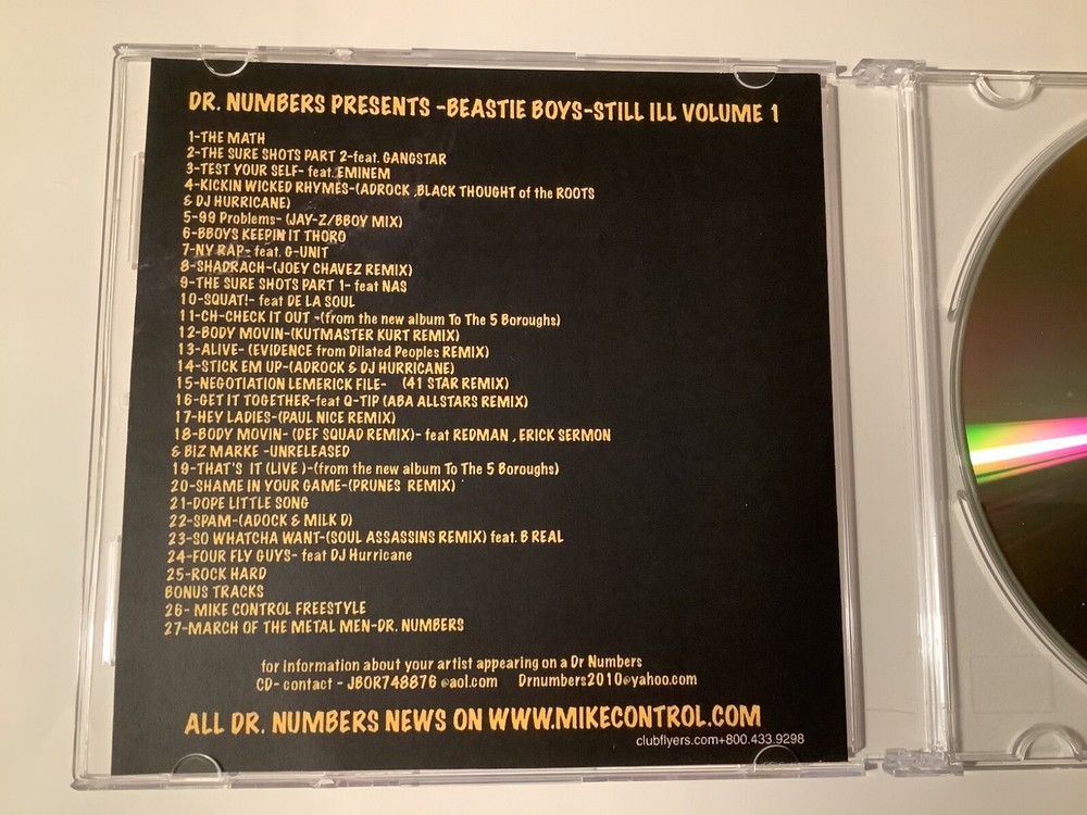 Rare original Dr. Numbers Beastie Boys Still Ill mixtape containing unreleased tracks, exclusive remixes and hard to find gems. Note some of Dr. Numbers' remixes go off beat at times.. dope or stupid, or stupid dope you decide. OG CDr has some minor wear very good condition, insert and slimcase are also very good. Disc has been tested all the way through and plays perfectly, no extra shipping charge for additional purchases.