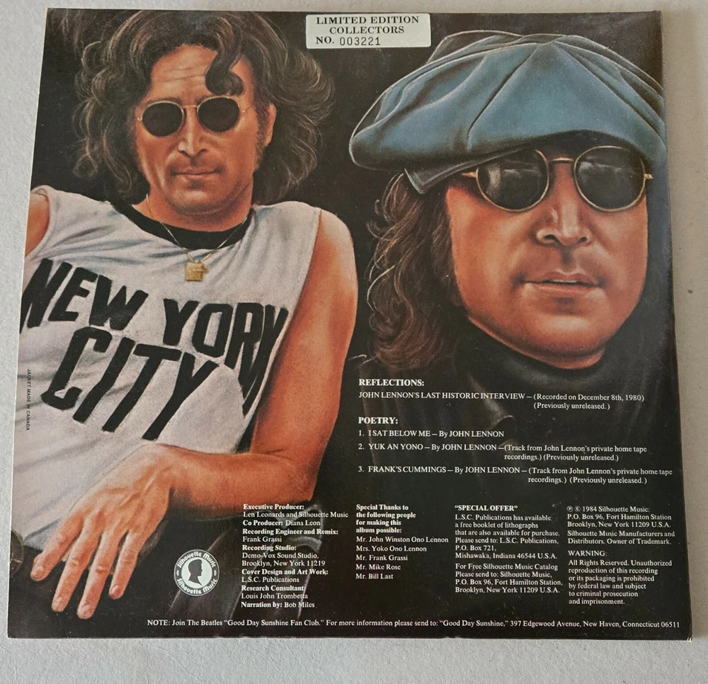 Excerpts of John Lennon's last interview on December 8th, 1980 plus poems. Number 3221 of 10000.A1John Lennon's Last Historic Interview 1980 (Reflections)B1John Lennon's Last Historic Interview 1980 (Reflections)C1John Lennon's Last Historic Interview 1980 (Reflections)D1John Lennon's Last Historic Interview 1980 (Reflections)D2I Sat BelonelyD3Jock And YonoD4The Wumberlog (Or The Magic Dog)