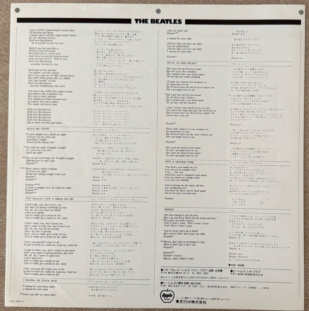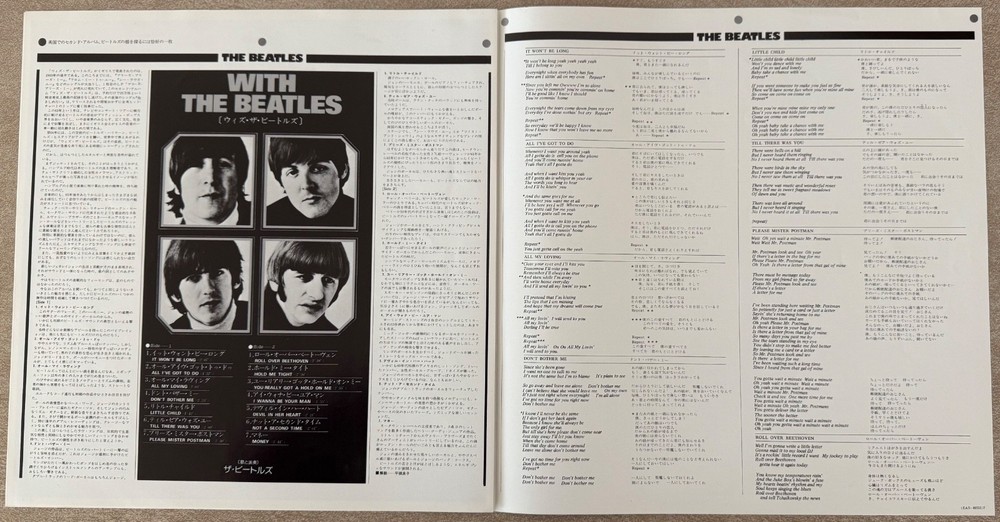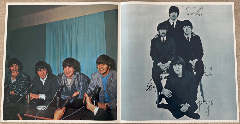 Photo and lyric insert from Please Please Me Japanese Import EAS 80550. Has a small hole in upper left corner, sourced from a new but "cutout" album. Mint condition otherwise.
