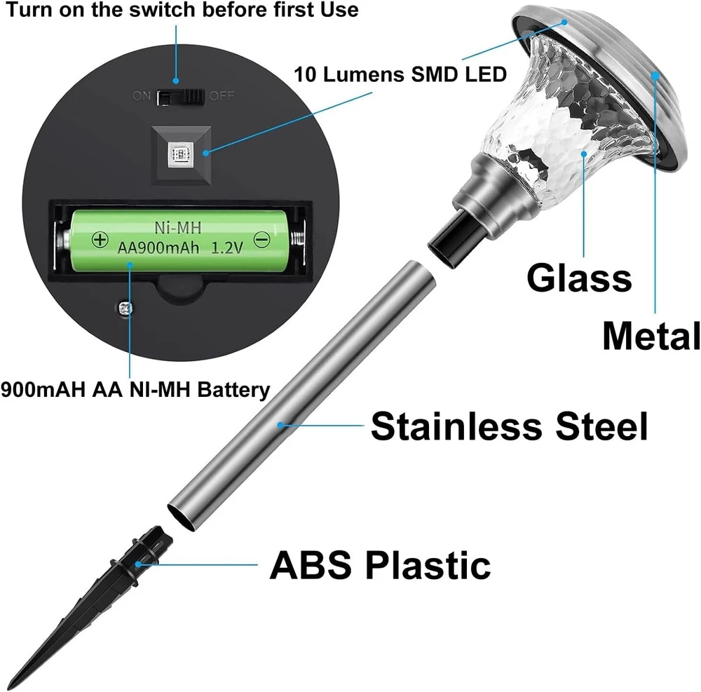 Specific Uses For Product: Yard Material: Stainless Steel Global Trade Identification Number: 00725704656994 Switch Type: Touch Color: Silver Number of Items: 4 Assembly Required: Yes Item Weight: 2.69 pounds Type: Does not apply Brand: B&G Beautiful Gardener UPC: 313042276242 Room Type: patio Mounting Type: Floor Mount Unit Count: 4.0 Count Light fixture form: Path Water Resistance Level: Waterproof Shade Color: User Selectable Multicolor / Fixed Color / Bright White color Finish Type: Powder Coated Included Components: Rechargeable Battery (AA Ni-MH) Control Method: Touch Indoor/Outdoor Usage: Outdoor Model Name: light07 Batteries: 8 AA batteries required. (included) Efficiency: High Efficiency Number of Light Sources: 4 Item model number: GL003 Shade Material: Glass Light Color: Bright White Lighting Method: Touch Installation Type: Free Standing Product Dimensions: 4.7"L x 4.7"W x 16.5"H Shape: Stake Voltage: 2 Volts Power Source: LED Manufacturer: B&G Beautiful Gardener Brightness: 10 Lumen Style: Modern Fixture Type: Non Removable Controller Type: Sliding Selectable Switch (Multicolor/ Fixed Color/Off /Bright Wh Is Discontinued By Manufacturer: No gtin13: 313042276242 Light Source Type: LED Special Feature: 3 Lighting Mode: Multicolor / Fixed Color / Bright White color