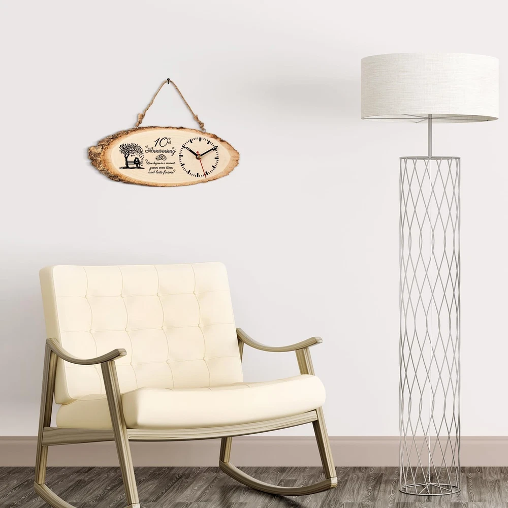 BeauGift 10 Year Anniversary Wedding Gifts for Him Her Husband Wife, 10th Anniversary Clock Gifts for Him Her Couple, 10 Year Anniversary Decorations Wooden Clock Product Details Style: 10 Years Anniversary Brand: BeauGift MPN: beaugift-kkymszx0086 UPC: Does not apply EAN: Does not apply Brand: BeauGift Color: Wood Color Display Type: Analog Style: 10 Years Anniversary Special Feature: Cordless Product Dimensions: 10.2"W x 4.3"H Power Source: batteries required Room Type: Living Room Shape: Oval Indoor/Outdoor Usage: Indoor Brand: BeauGift Color: Wood Color Display Type: Analog Style: 10 Years Anniversary Special Feature: Cordless Product Dimensions: 10.2"W x 4.3"H Power Source: batteries required Room Type: Living Room Shape: Oval Indoor/Outdoor Usage: Indoor Material: Wood Frame Material: Wood Are Batteries Included: No Mounting Type: Tabletop, Wall Mount Number of Items: 1 Operation Mode: Electrical Dial Color: black Clock Form: Mantel Size: Large Manufacturer: BeauGift Item Weight: 7.4 ounces Item model number: beaugift-kkymszx0086 Date First Available: March 12, 2025 10 Year Anniversary Gifts for Him: Celebrate your happy day with our 10 year anniversary gifts! Get them a present as special as they are with our 10 year wedding anniversary gifts. This is ideal as 10 year anniversary gifts for wife, 10th anniversary gifts for him, or 10th anniversary gifts for couple. Unique Design of Carved Wood Clock: Traditional clocks will make a "tick-tock" sound when used, and will seriously disturb family members' sleep and work. Our clock adopts high-quality Santai movement, which can provide a quiet home environment and bid farewell to annoying ticking. Using high-quality log cutting material, the texture of each piece of wood has deviation. The appearance is exquisite and practical, and the dial scale is straightforward and standard. DIY Wooden Clock: Our wooden clock is unique. The package includes a shelf, a wall, a clock core and power flow. The clock does not include batteries, so you need to buy and install it yourself. DIY design has expanded more experiences and fun, making this gift more meaningful. Perfect Wall Decoration: There is a hanging rope at the top of the clock, which can be hung on the wall as a wall clock. There is a bracket in the package, which can be placed on it as a desk & shelf clock. Combining modern science and technology with classical aesthetics, it is a unique ornament, which can be placed on windowsill, desktop, counter, bedside table or fireplace. No matter where you put it, it is a beautiful scenery that meets all your decoration needs. Romantic Keepsake: The traditional 10 year anniversary gift can be placed on the desk shelf or bedside as 10th anniversary decorations. The surface on our 10 year wedding anniversary gifts is also engraved with meaningful quotes. Your love grows stronger with time like a clock.