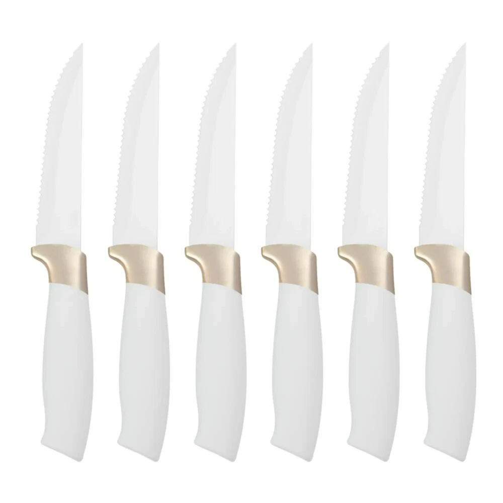 Beautiful 12 Piece Knife Block Set w/ Soft Ergonomic Handles by Drew Barrymore Purposeful tools create purposeful kitchen moments. The Beautiful 12 Piece Knife Block Set features a variety of knives and all-purpose shears to slice, dice, mince, cut, and more. Innovative knives and scissors feature white soft grip handles with our signature gold accents that fit comfortably in your hand. Durable stainless steel blades feature a stick resistant, resin coating that limit food from adhering to the knife and allow for easier, more efficient cutting. Store and display in our signature knife block that will look beautiful on your kitchen counter. 12 Piece Knife Block set includes: 8-inch chef knife, 5.5- inch serrated utility knife, 5-inch Serrated Santoku knife, 3.5- inch paring knife, (6) 4.5-inch Steak Knives, All Purpose Shear, White Block. Knives and shears are hand-wash only; wipe block clean with a damp cloth. Lifetime Limited Warranty. BPA-free. 12 PIECE KNIFE BLOCK SET INCLUDES: 8 inch chef knife, 5.5 inch serrated utility knife, 5 inch Serrated Santoku knife, 3.5 inch paring knife, (6) 4.5 inch Steak Knives, All Purpose Scissors, White Knife Block STICK RESISTANT: Each blade is crafted from stainless steel and features a stick resistant, resin coating that limits food from adhering to the knife; this allows for easier, more efficient cutting. COMFORTABLE HANDLES: Ergonomically designed handles feature a soft grip for comfort in the hand while using. RAZOR SHARP: Each knife features a high-carbon, stainless steel blade which ensure the knife retains its ultra-sharp edge and making food prep effortless. EASY CARE: Hand wash with warm water and a mild detergent. Rinse and dry immediately. Stainless steel knives are not dishwasher safe. Beautiful 12 Piece Knife Block Set with Soft-Grip Ergonomic Handles White and Gold by Drew Barrymore: 5306062 Specifications Features Ergonomic Handle, Rust Resistant Material Metal - Stainless Brand Beautiful Assembled Product Dimensions (L x W x H) 12.50 x 3.30 x 12.00 Inches