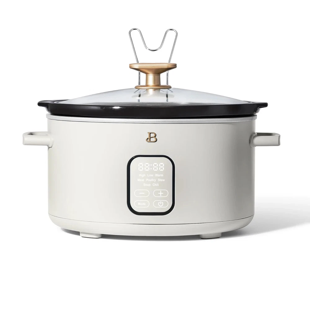 Beautiful 6 Qt Programmable Slow Cooker, All Color by Drew Barrymore, USA Stock, Free N Fast Shipping From USA Product details The Beautiful 6 Qt Programmable Slow Cooker is a kitchen must-have with 5 preset functions and capacity to serve up to 7 people. Thoughtfully designed with sleek, touch-activated illumination and our signature gold accents, this Beautiful Slow Cooker also features a soft matte premium finish. Created by Drew Barrymore, Beautiful Kitchenware® combines elegant design and contemporary colors for high-performance appliances that look beautiful on your kitchen counter. Condition: new. Large 6 qt capacity, serves up to 7 people 5 preset slow cooking functions – Meat, Poultry, Stew, Soup and Chili Touch-activated display illuminates only when you need it. Automatically switches to keep warm function Dishwasher-safe, removable cooking pot and tempered glass lid for easy cleaning Programmable digital countdown timer from 30 minutes up to 24 hours Removable ceramic pot for easy serving Stainless-steel lid rest for easy handling while serving Cool-touch handles for easy portability Shatter-resistant, tempered glass lid Condition: new Specifications Brand Beautiful Color Cornflower Blue Material Ceramic, Stainless Steel, Tempered Glass Assembled Product Weight 14.33 lb Volume Capacity 6 qt Cord Length 26 in Maximum Temperature 300 ºF Watts 210 W Features Dishwasher Safe Parts, Digital Display Manufacturer Made By Gather Manufacturer Part Number 19166 Model 19166 Assembled Product Dimensions (L x W x H) 11.22 x 11.92 x 17.16 Inches
