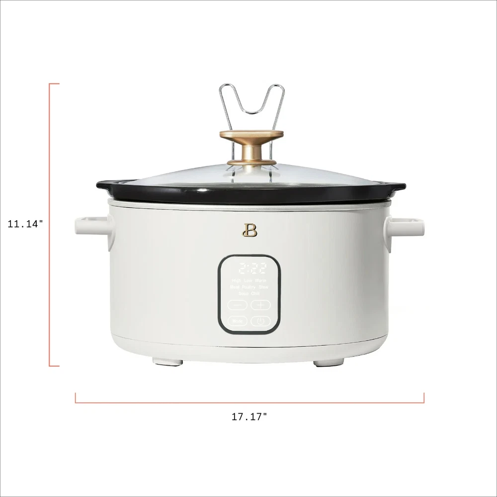 Product details The Beautiful 6qt Programmable Slow Cooker by Drew Barrymore is built to take the stress out of mealtime. With 5 preset functions, 3 heat settings and a programmable countdown timer, it’s easy to get dinner started—then get on with your day. When the cooking’s done, it automatically switches to Warm so your food is always ready when you are. With a convenient steel lid holder to make serving easier and cool touch handles for easy portability, this slow cooker is perfect for every family size and lifestyle. Large 6qt capacity, serves up to 7 people 5 preset slow cooking functions: Meat, Poultry, Stew, Soup and Chili 3 heat settings: High, Low, and Warm Steel lid holder for easy serving and to keep countertops clean Warm function turns on automatically Programmable digital countdown timer from 30 minutes up to 24 hours Integrated flat design control panel Touch-activated display illuminates only when you need it Tempered glass lid is shatter-resistant Cool-touch handles for easy portability Removable ceramic pot for easy serving Dishwasher safe removable ceramic pot and tempered glass lid