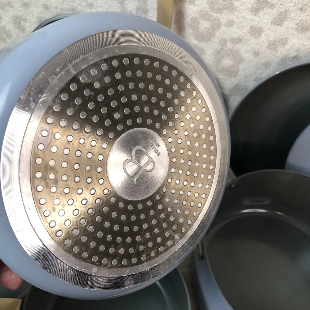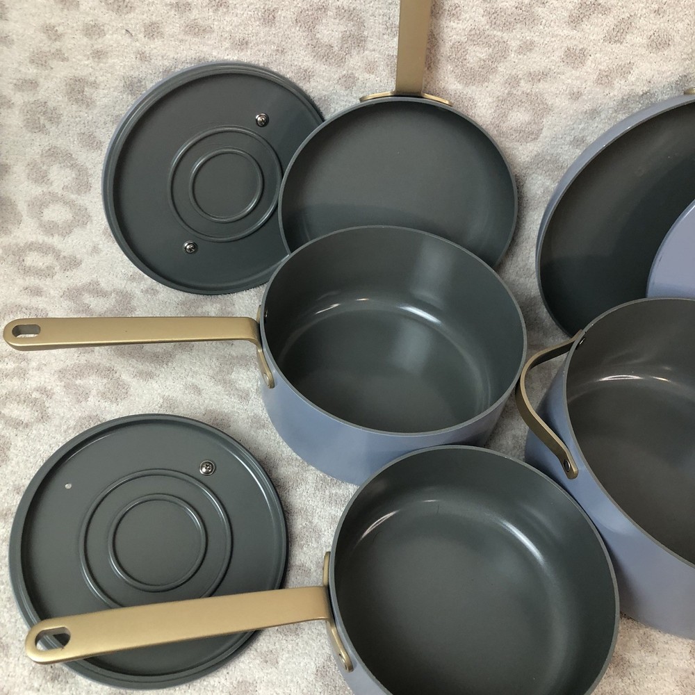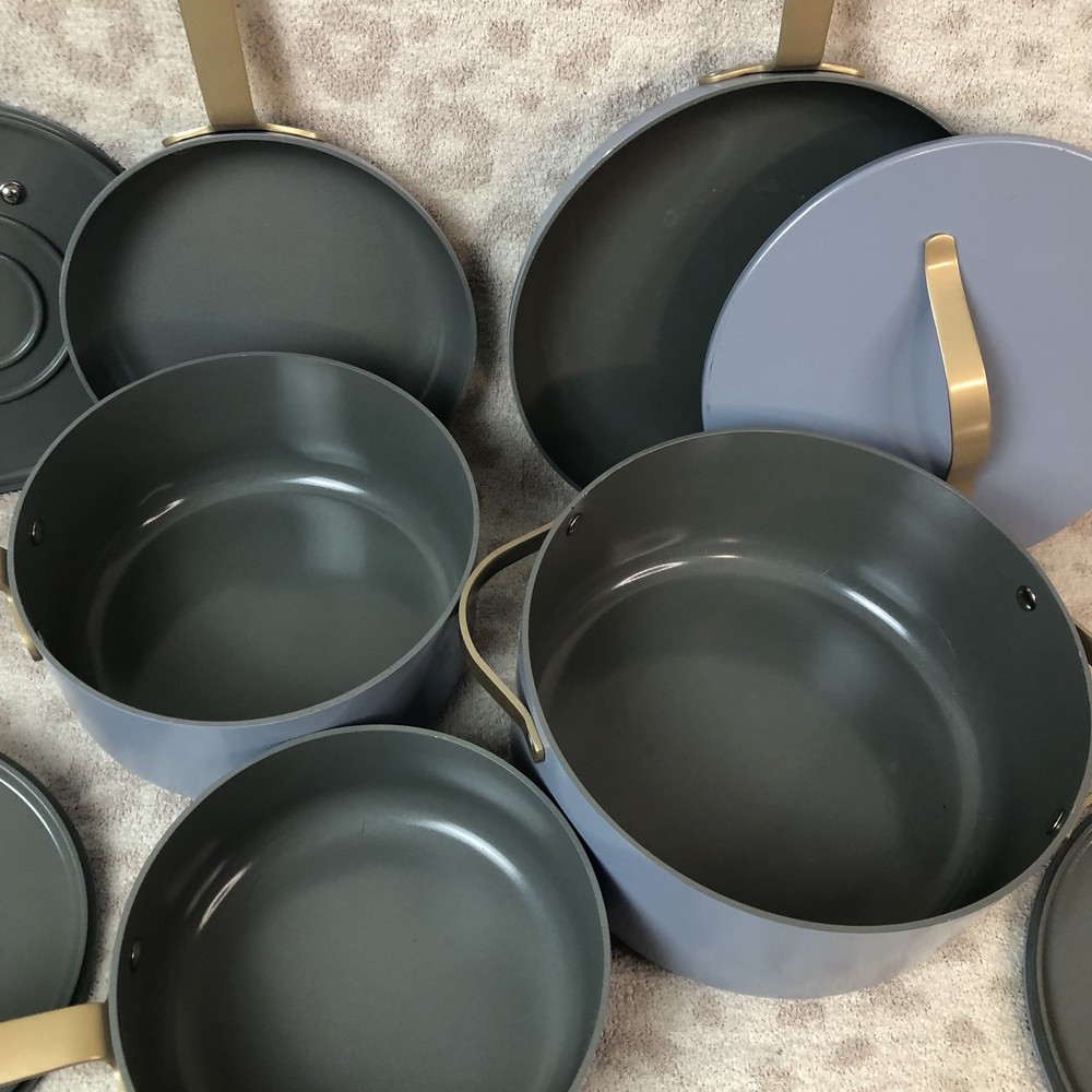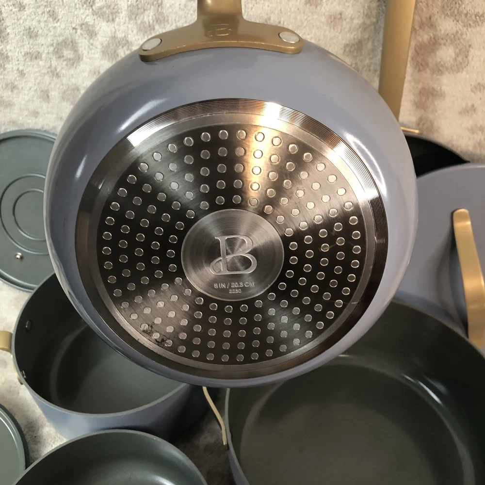 Stove Type Compatibility:Electric, GasMaterial:CeramicFeatures:Non-StickBrand:Drew BarrymoreSet Includes:See PicsUPC:Does not applyColor:Gray Bluegtin13:Does not apply