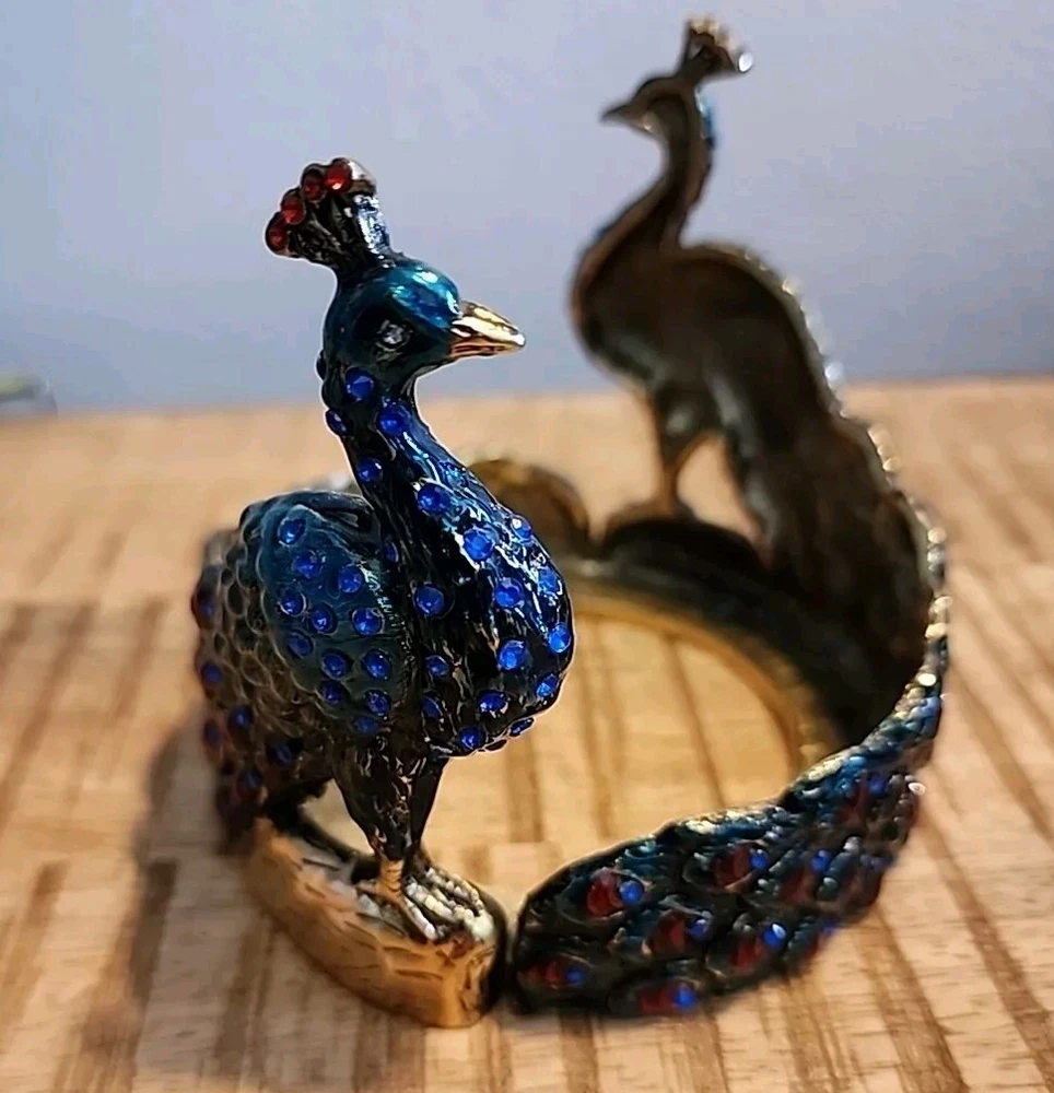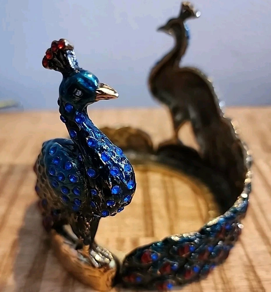 Beautiful Bejeweled Enamel Hand Painted Solid Brass Twin Peacocks Candle Holder