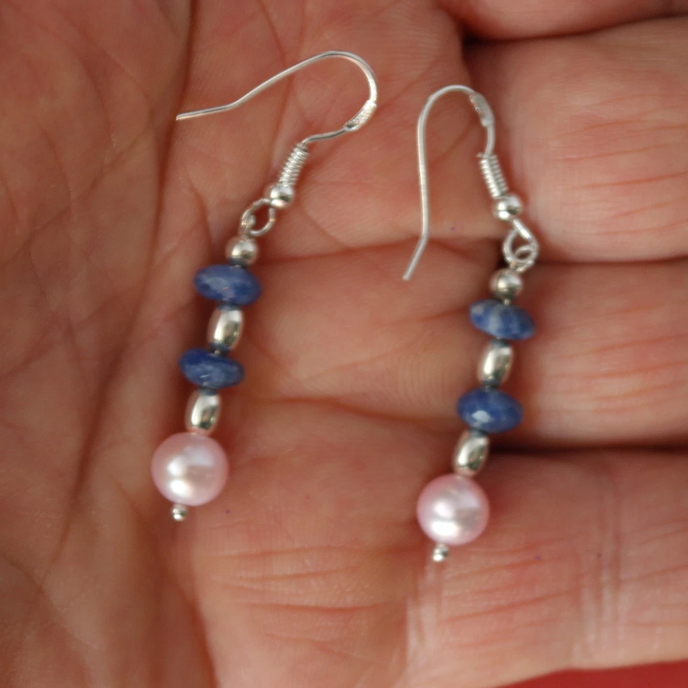 Beautiful Earrings With Lapis And Pink Pearls 2.3 Gr.3 Cm.Long + Silver Hooks