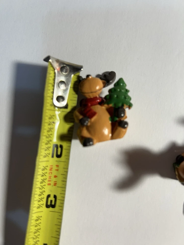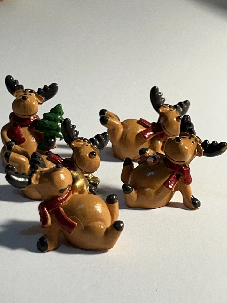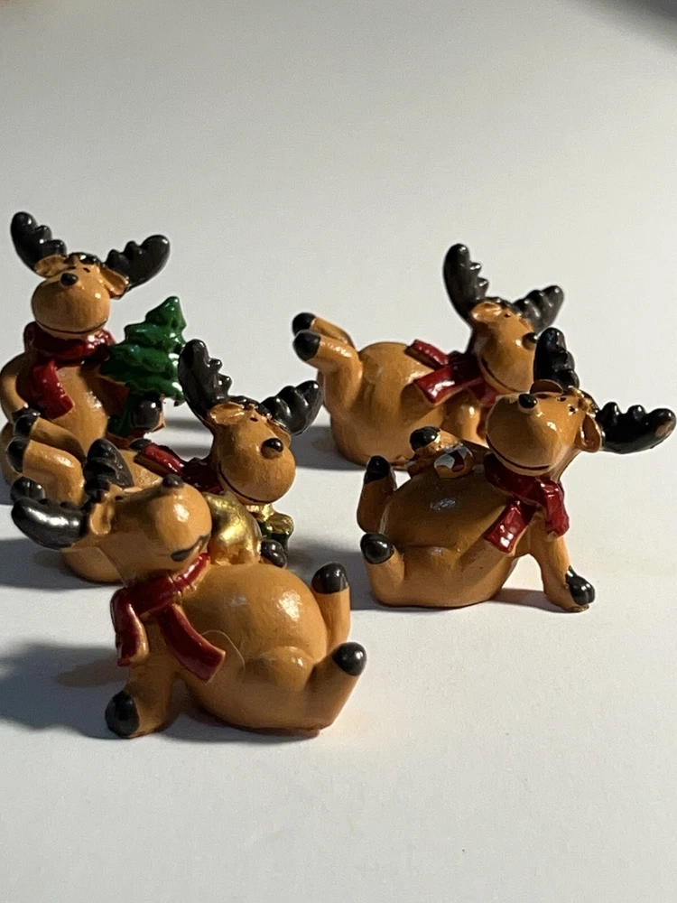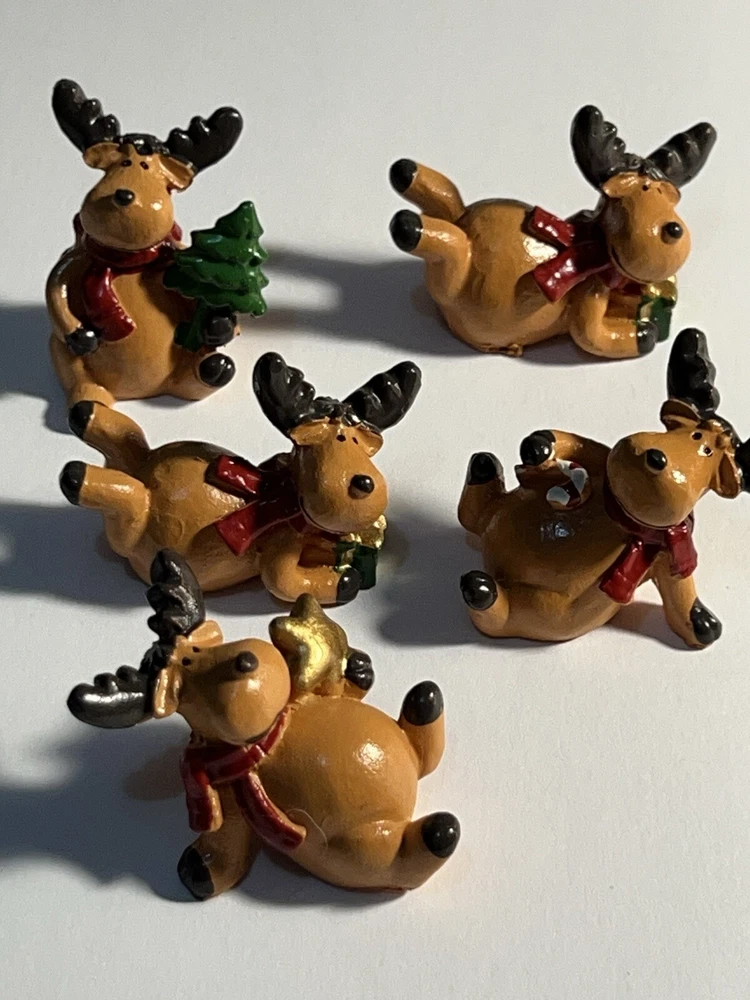 This lot includes 5 small Christmas decorations in the shape of animal deers, featuring a brown color with red ties. The design is abstract and art deco in style, with a character named Abra Kadabra. These decorative pieces are acrylic-made and part of the Animals collection, specifically themed around Animation. Suitable for adults, they would make a unique addition to holiday decor with their festive yet artistic appeal. Cute
