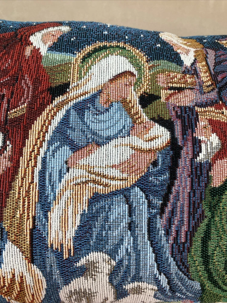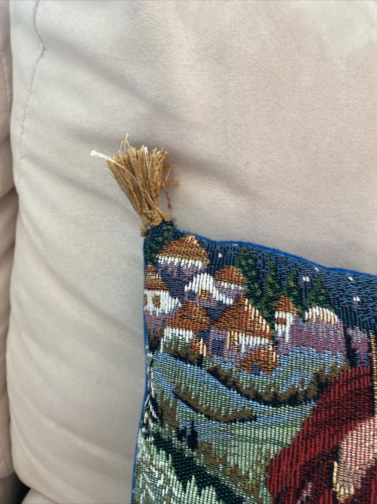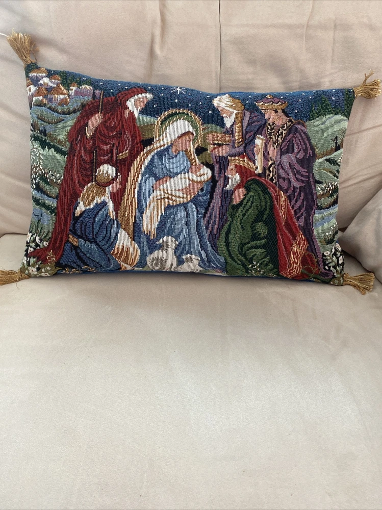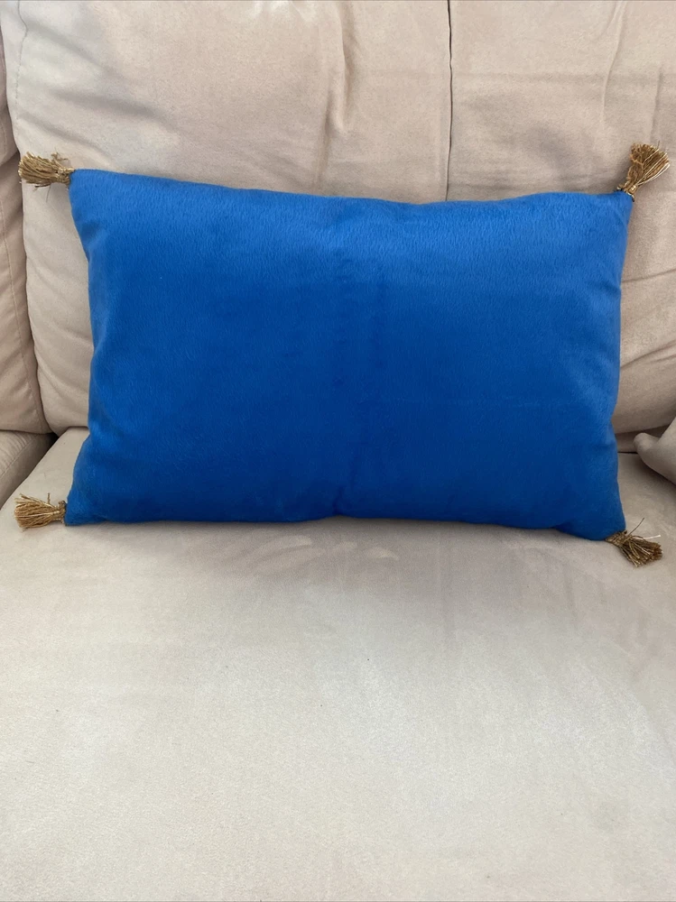 Gorgeous! New decorative accent pillow. 12”x 16”. Tapestry front. Blue soft fabric back. Tassels on corners. Only one available.