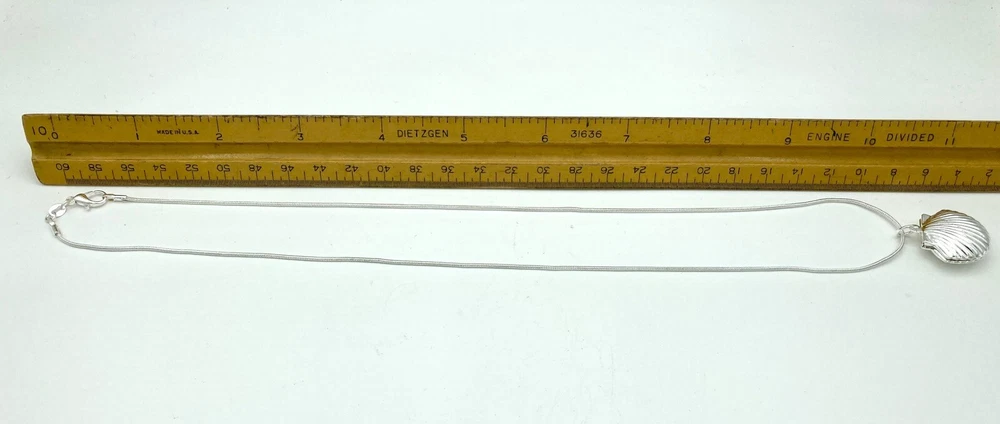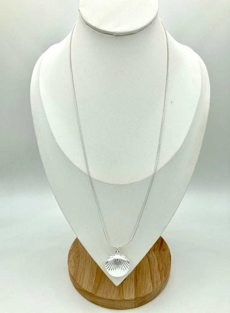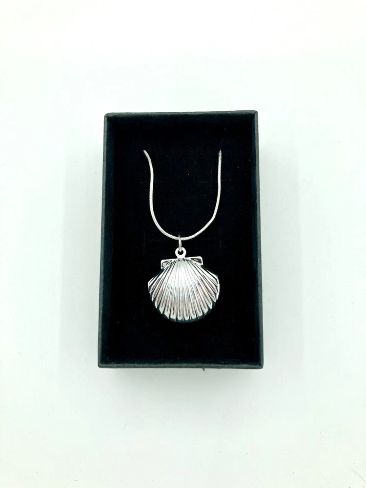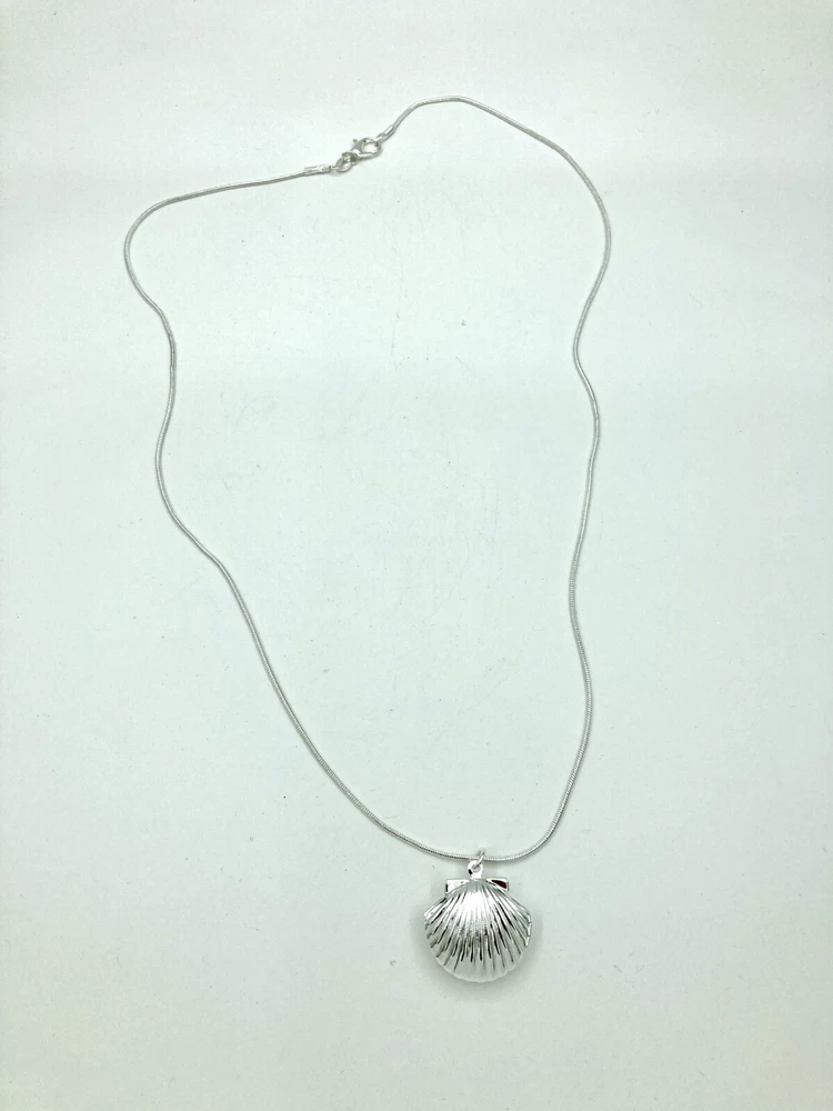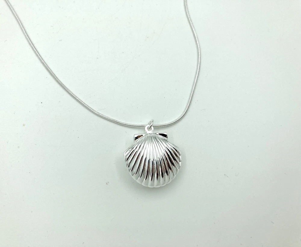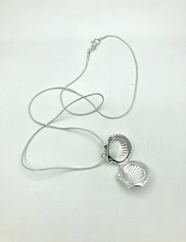 This beautiful seashell shaped locket is a perfect addition to your jewelry collection. The silver tone long chain of 20 inches complements the unique pendant shape, which is designed to hold two photos of your loved ones. The lobster closure ensures a secure fit and easy wear. The chain type is a beautiful serpentine design, and the necklace length is perfect for a statement piece. The necklace is ideal for those who love nature, beach, and fashion. The main stone is not included, making it a versatile piece for any occasion. This item is used and may show signs of cosmetic wear. It comes with what is shown in the pictures. No other items are included. If you have a question or concern, please let us know and we will work with you to address the issue. All products are cleaned and sanitized. We strive for excellent customer service and stand behind our products.
