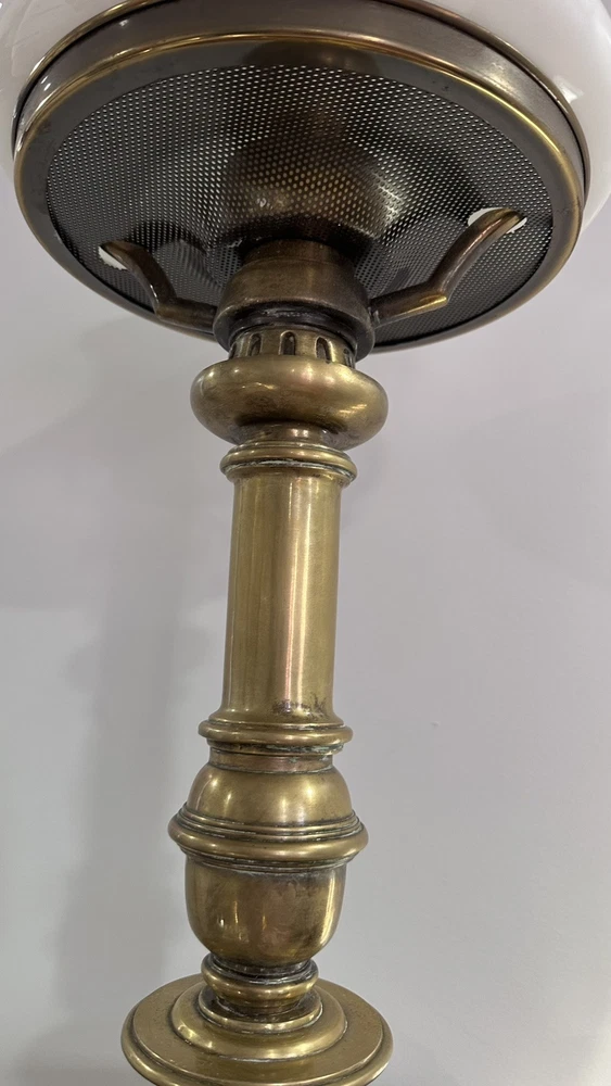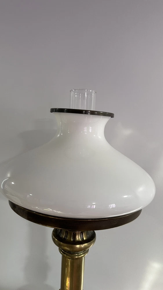 This is a vintage desk lamp crafted from brass in a mid-century modern style. It is an electric lamp that exudes an antique charm. Perfect for collectors or those looking to add a touch of vintage flair to their living or office space. It has an absolutely beautiful milk glass globe there is a small chip in the globe but you cannot see it when the globe is on the lamp. The lamp is heavy and stands approximately 3ft high.