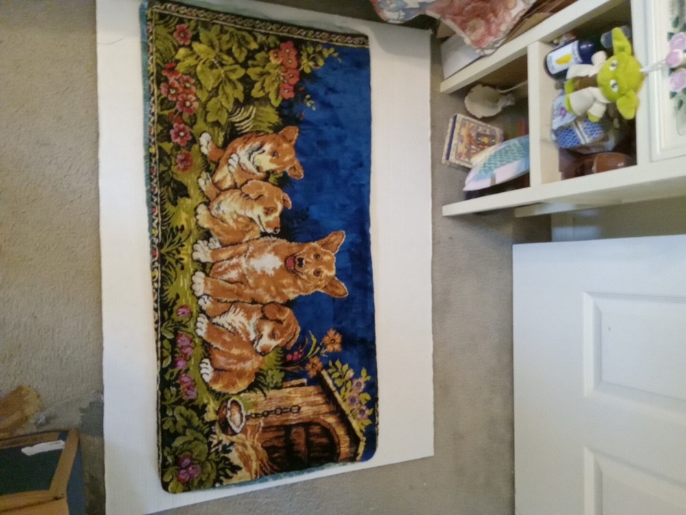 This pillow cover features a beautiful vintage design of a Corgi dog with three pups, made from a tapestry material. The cover measures 35x17 inches and has a zip closure. The design is colorful and retro, perfect for a kids' room or any vintage-themed decor.