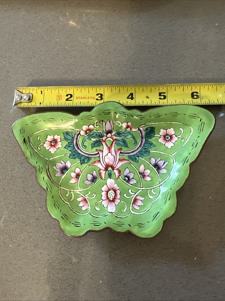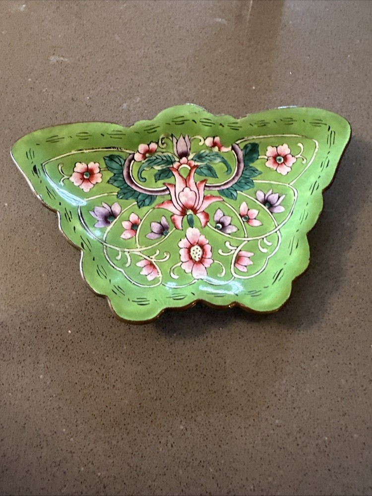 This vintage enamel decorated butterfly shape jewel trinket dish is a beautiful and unique piece that adds a touch of bohemian style to any room. The multicolored enamel finish and butterfly shape make it a charming decorative collectible, perfect for storing small trinkets or jewelry. The craftsmanship and attention to detail in this small dish showcase the intricate artistry of the brand Butterfly, adding a whimsical and elegant touch to any space.
