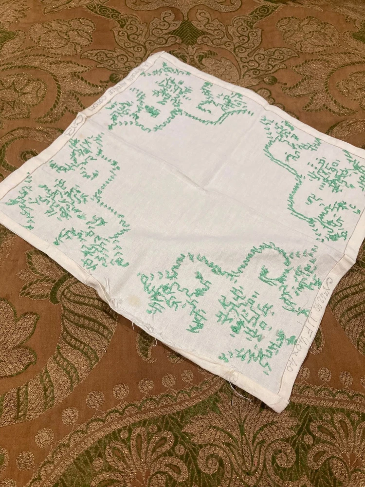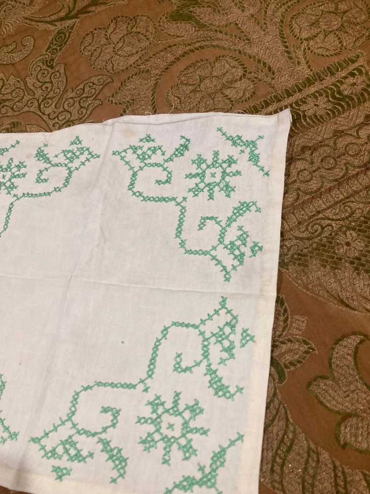 Vintage White Linen Doily with Green Cross Stitch Embroidery - 12" x 12" - Floral Design Measurements: 12" x 12" (square) Condition: Vintage This charming vintage linen doily features delicate green cross stitch embroidery in a pretty floral and vine pattern at each corner. A lovely example of vintage needlework! Features: White linen fabric Green cross stitch embroidery Floral and scrollwork motifs in each corner Four symmetrical corner designs Hand-embroidered details Square shape Simple, elegant vintage style Condition Notes: Shows vintage wear including some discoloration, age spots, and general signs of use consistent with age. Please review photos carefully. Perfect For: Vintage table décor Under lamps or decorative items Tea time or coffee table accent Shabby chic or cottage décor Framing as textile art Vintage linen collectors Cross stitch enthusiasts Wedding or special occasion décor Gift for needlework lovers Display in china cabinet A sweet piece of vintage handwork! The green cross stitch corner designs add a fresh, cheerful touch to this classic white linen doily. Authentic vintage hand embroidery - 12" square!