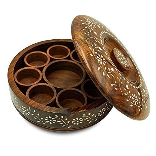 SUPER STRONG AND STURDY BUILT - You will receive a highly durable wooden masala spice box which doesn't break apart easily as we have double nailed each joint for your daily rough & tough usage. MATERIAL AND DESIGN - This sheesham wooden box with 9 sections and a spoon is great to store Indian spices This multipurpose utility box can also be used to store and serve refreshners, dry fruits and keep your knick knacks like jewellery, small items at one place EASY TO USE SPICE BOX - The natural brown color of this multipurpose box enhances it's look and has 9 individually separated compartments. The containers can be used separately to store spices and other uses like for storing dry fruits, keep jewelry, serve fresheners and keep your Nick Knacks. FOOD GRADE WOOD MATERIAL - 100 percent food grade, light weight and easy grip hold. Serve your guests, store leftovers, add beauty to your kitchen and dining area with this wooden handcrafted sheesham wood masala dabba.