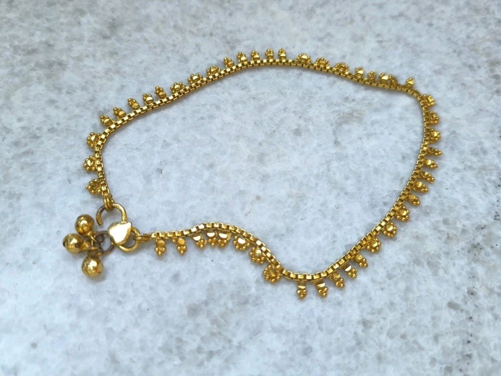 This beautiful vintage anklet in Indian style is a stunning piece of jewelry perfect for special occasions like engagements and weddings. The round disc-shaped charm with a gold color and intricate details showcases the traditional Indian design and craftsmanship. The anklet exudes a bohemian and ethnic vibe, adding a touch of beauty and artistry to any outfit. Imported from India, this unique piece is sure to make a statement and add a touch of vintage elegance to your ensemble.