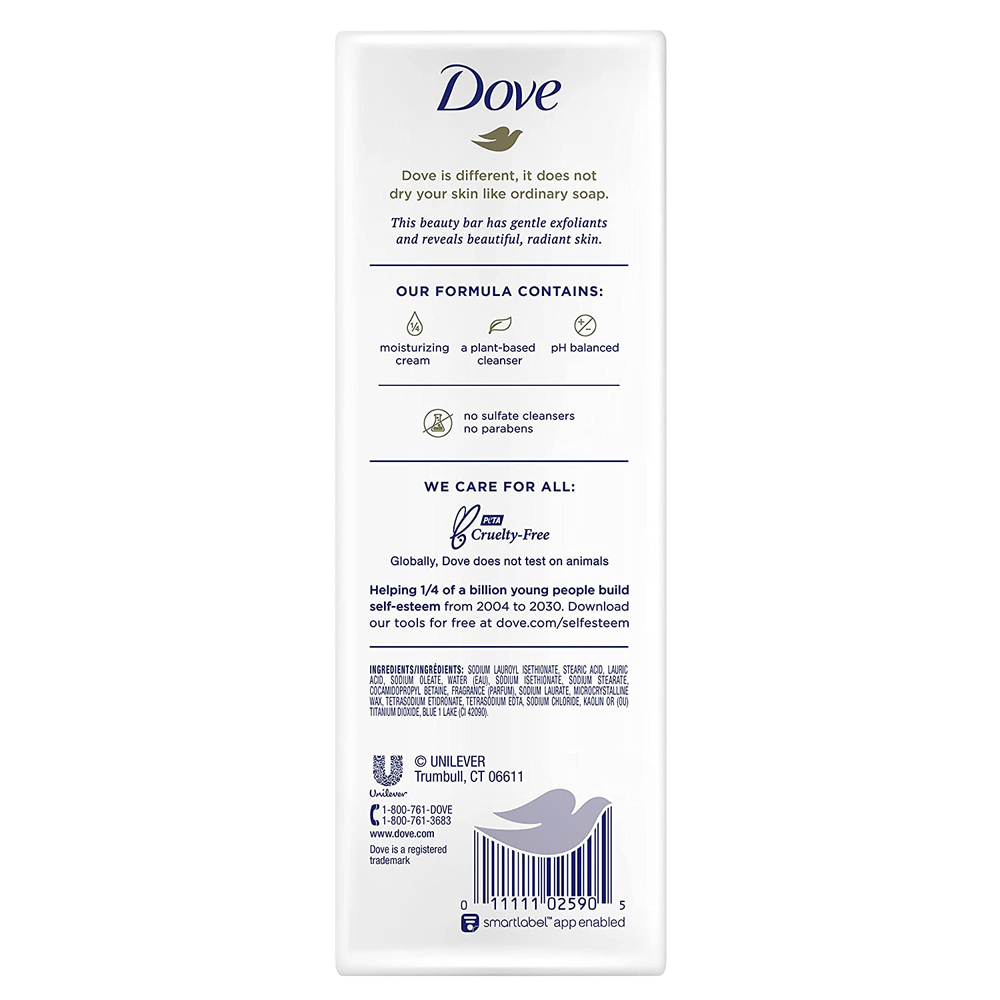 LOCK IN MOISTURE: Dove Gentle Exfoliating Beauty Bar, with exfoliating beads, nourishes and revitalizes skin to give you softer, smoother, more radiant-looking skin than ordinary bar soap. GENTLE EXFOLIATION: Dove Beauty Bar is made with exfoliating beads to wash away dead skin without drying skin like ordinary bar soaps. It’s gentle enough to use every day on both body and face. DERMATOLOGIST RECOMMENDED: Formulated with mild cleansers and 1/4 moisturizing cream, Dove moisturizing Beauty Bar leaves skin instantly soft and smooth with lasting nourishment. RICH HYDRATION: Help maintain your skin’s natural moisture barrier and hydration with this Beauty Bar, ideal as a cleanser for your face and body. THOUGHTFULLY MADE: This Beauty Bar contains no sulfate cleansers and is certified Cruelty-Free by PETA, so you can feel good about switching from an ordinary soap bar to a Dove Beauty Bar. We’ve all been told that exfoliation is an important part of a skin care routine, but that doesn’t mean being rough with your skin — skin exfoliation should be gentle. That’s where Dove Gentle Exfoliating Beauty Bar comes in. It combines the gentlest skin cleansers with exfoliating beads to wash away dead skin, giving you soft, smooth skin. Suitable for regular use as a facial cleanser or as a gentle skin cleanser for your body and hands, the Gentle Exfoliating Beauty Bar leaves skin feeling beautiful and revitalized. For best results, rub your Dove Beauty bar cleanser between wet hands and massage the smooth, creamy lather over your skin before rinsing thoroughly. The secret to beautiful skin is moisture, and no other bar soap hydrates skin better than Dove. That’s because Dove isn’t a soap; it’s a Beauty Bar. Formulated with mild cleansers that care for skin as you cleanse, Dove Beauty Bar helps deliver nourishment and leaves your face and body feeling soft and smooth and looking more radiant than ordinary soap does. That’s why we call it a Beauty Bar. At Dove, our vision is of a world where beauty is a source of confidence, and not anxiety. Our mission is to help the next generation of women develop a positive relationship with the way they look, helping them raise their self-esteem and realize their full potential.